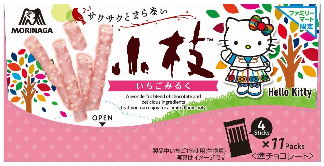 【発売地域】全国【内容】ハローキティと森永製菓の小枝がコラボした商品です。小枝ならではのサクサク食感が楽しめる期間限定いちごみるく味のチョコレート菓子です。※画像はイメージです。