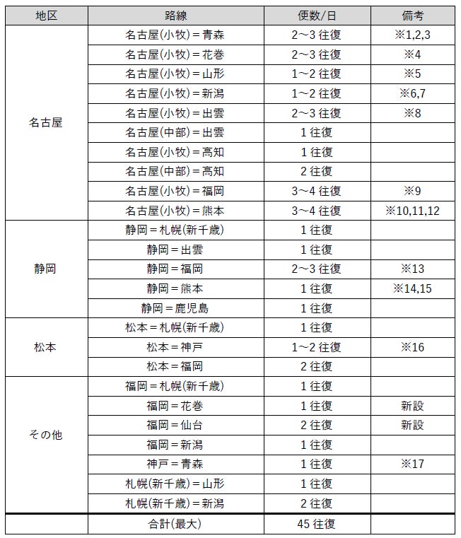 『名古屋(小牧)=青森、花巻、山形、新潟、出雲、福岡、熊本』、『静岡=福岡』『松本=神戸』線の一部便、『静岡=熊本』『神戸=青森』線は、今冬ダイヤ期間中は期間限定での運航となります。