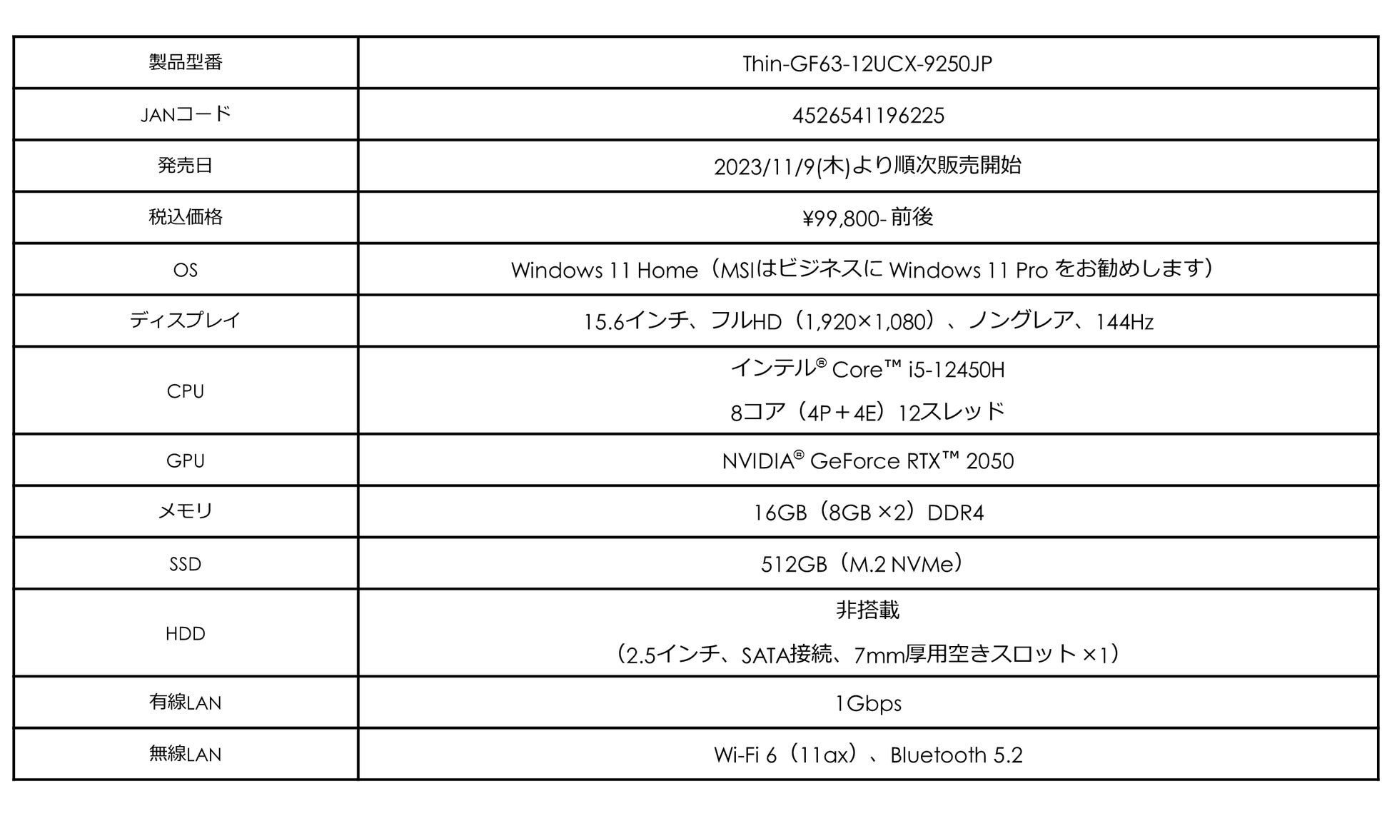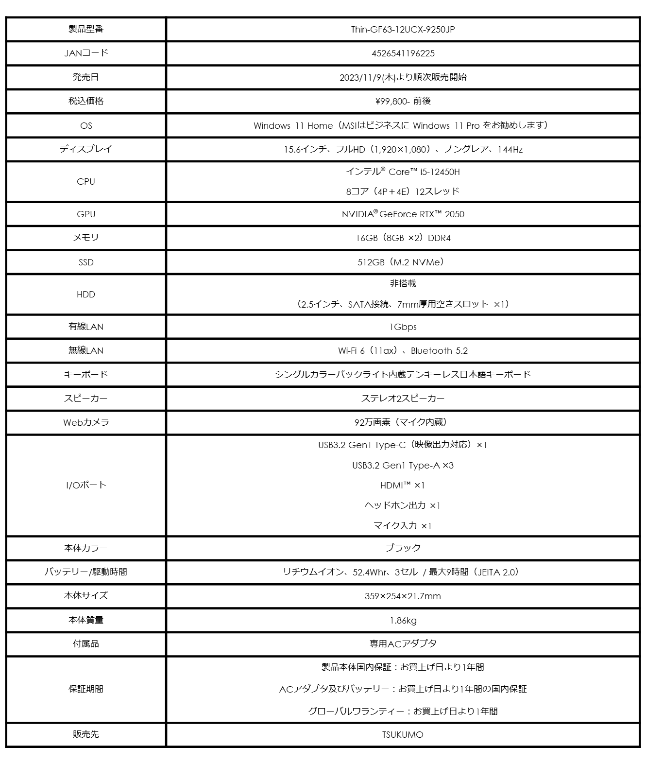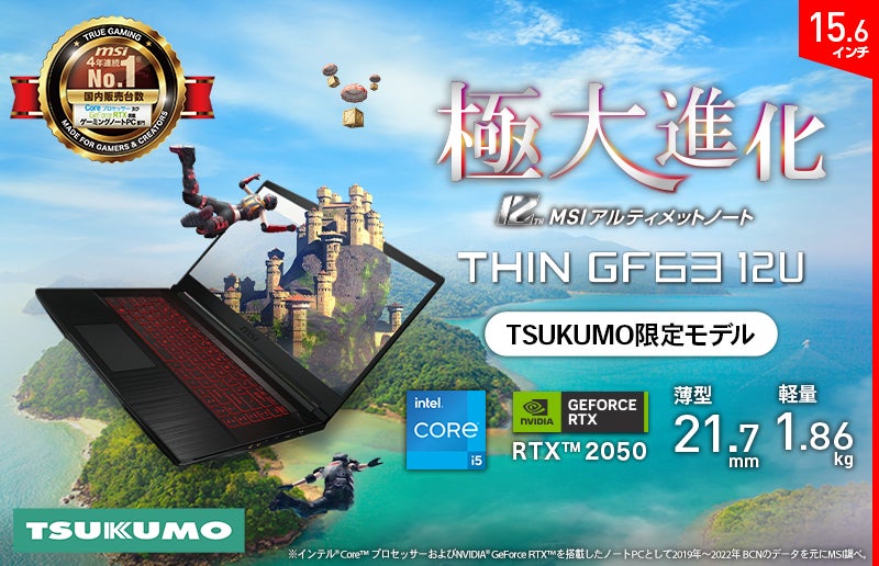 「GeForce RTX™ 2050」と「Core™ i5」搭載で税込10万円以下を実現!! 薄型・軽量ゲーミングノートPC TSUKUMO限定モデル「Thin-GF63-12UCX-9250JP」