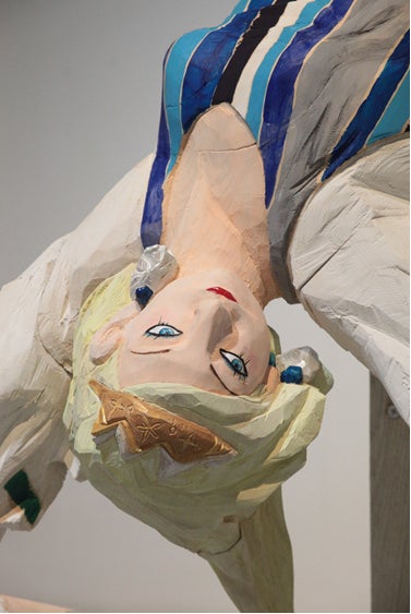 飯沼英樹は、華やかな衣装とメイクを纏ったスタイリッシュな女性をモチーフにした彫刻作品を手掛けるアーティストです。2006年までの5年間、ヨーロッパの各地で活動し、帰国してからは東京を拠点に活動しています。2000年頃から一貫して“現代を生きる女性”をテーマにしています。ファッションフォトからインスピレーションを受けながら、スカートの裾の流れ、髪の毛のうねり、身体の傾きなど、写真では伝わりにくいディテールや動きを立体的に表現しています。木を材料に使い、女性たちを動的な存在として表現することで、彼女たちが持つ内面の感情を引き出しています。女性に対する敬意と男性としての視点が同時に反映された飯沼の作品は、安易な美しさやかわいさにとどまらない不敵な魅力を持ちます。