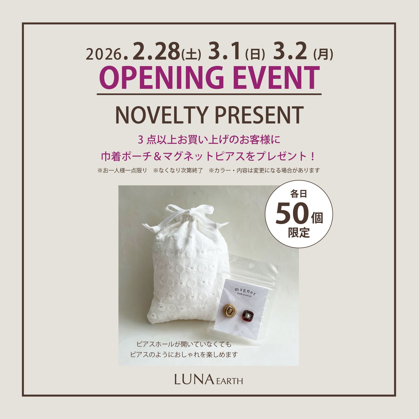 商品を3点以上お買い上げのお客様に、巾着ポーチ&マグネットピアスのセットをプレゼントいたします。