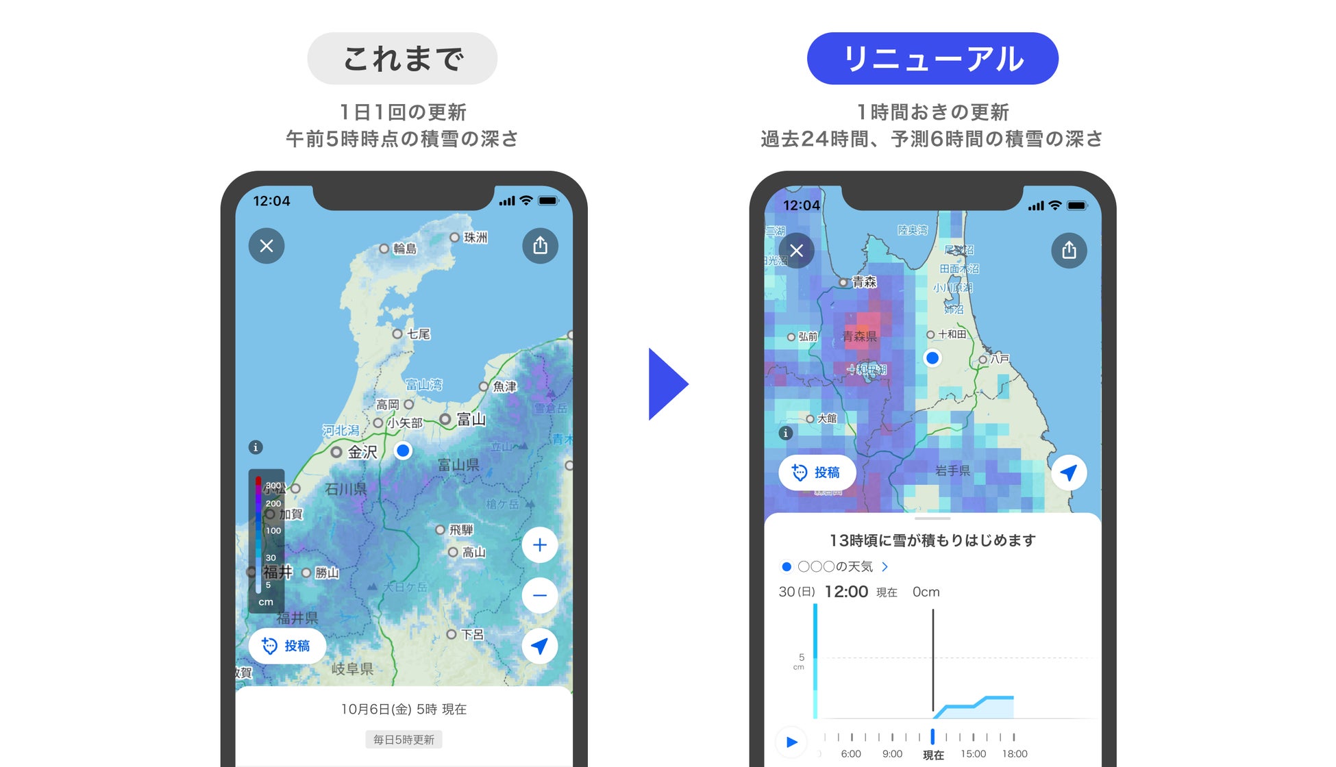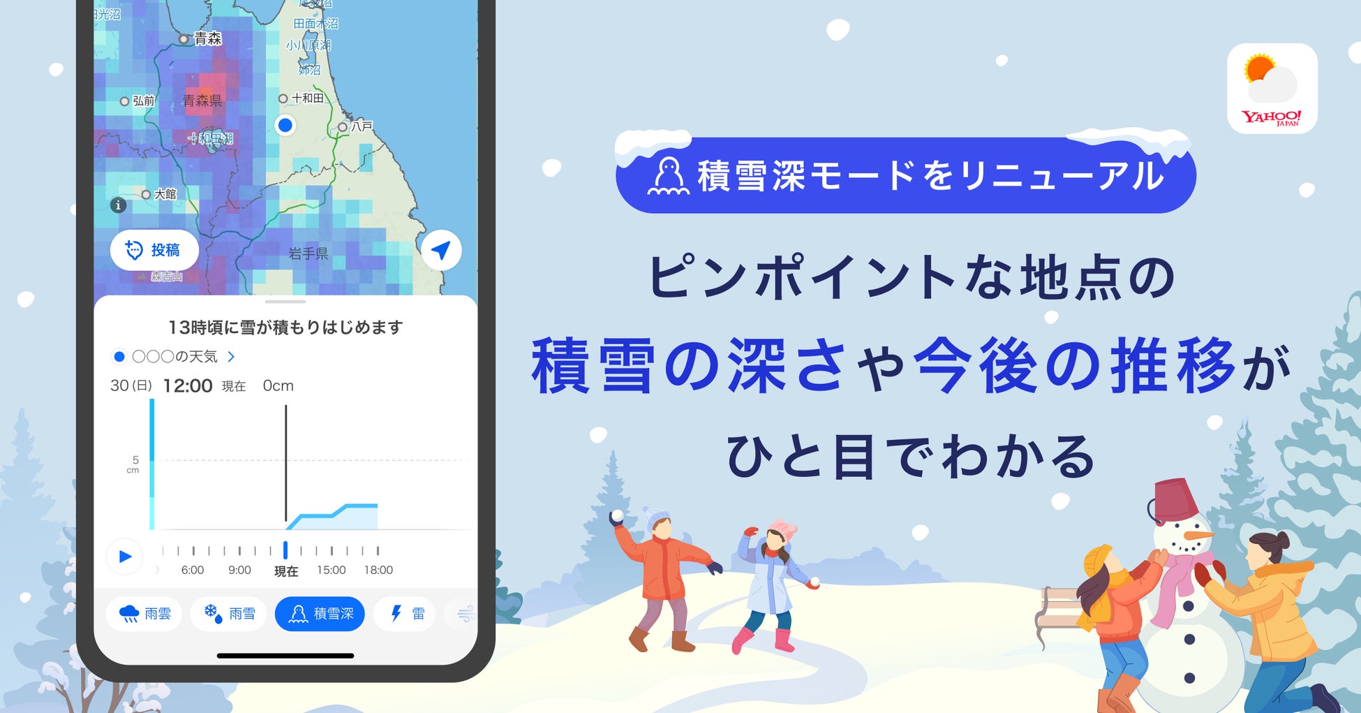 LINEヤフー株式会社(以下、LINEヤフー)が提供する、累計6,300万ダウンロード(※1)を突破した「Yahoo!天気」アプリは本日、雪の積もり具合を12段階で地図上に表示する「積雪深モード」をリニューアルしました。これにより、レーダーで表示した地点の積雪の深さについて、24時間前から6時間後までの予測を、スライダーを操作することで簡単に確認できるようになりました。また、「雨」と「雪」を見分けられる機能である「雨雪レーダー」も本日より提供を開始しました。