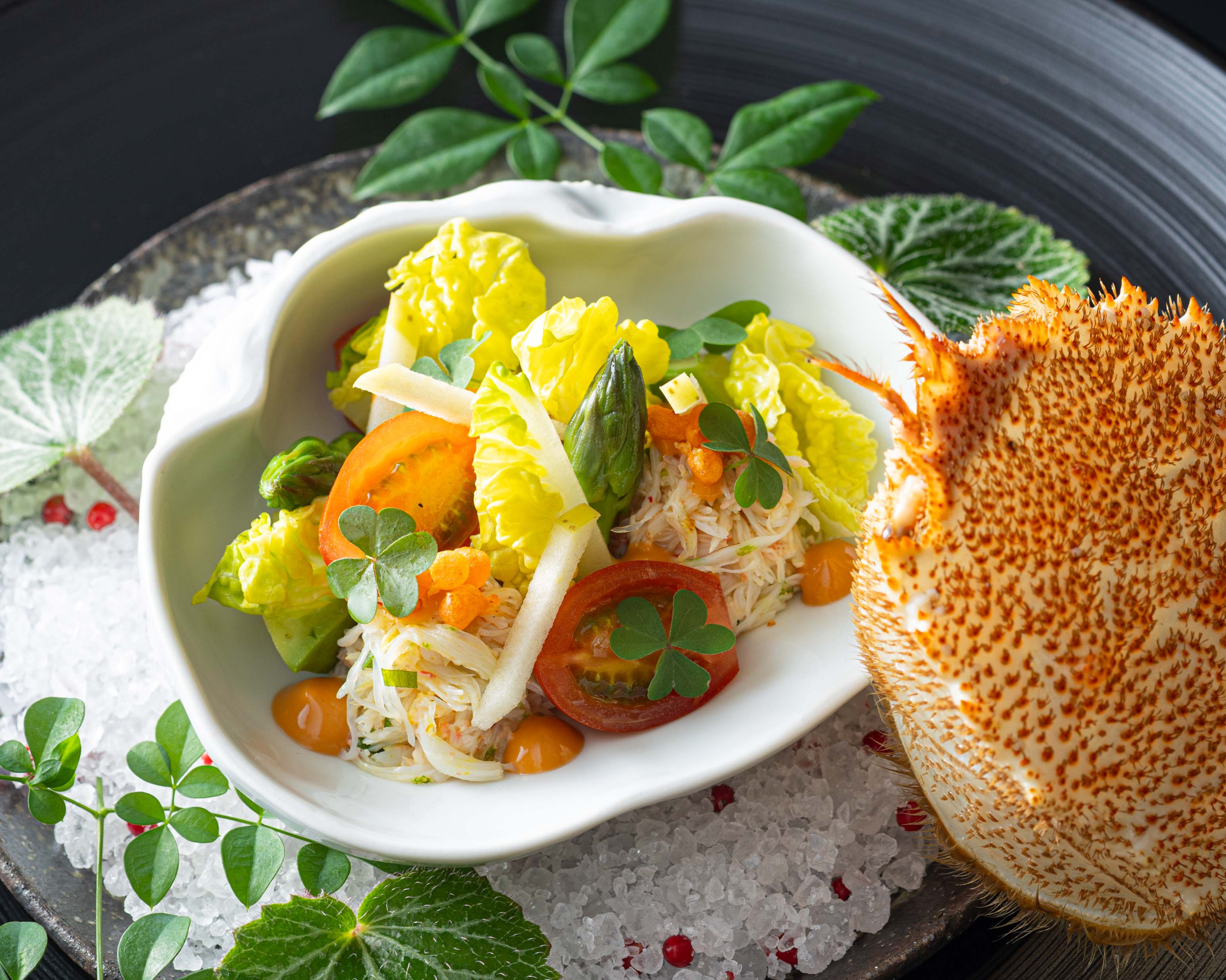 前菜は、北海道噴火湾産の毛蟹を、糖度10度の濃厚なトマトとグリーンアスパラガスとともに仕立てた、至福のサラダです。