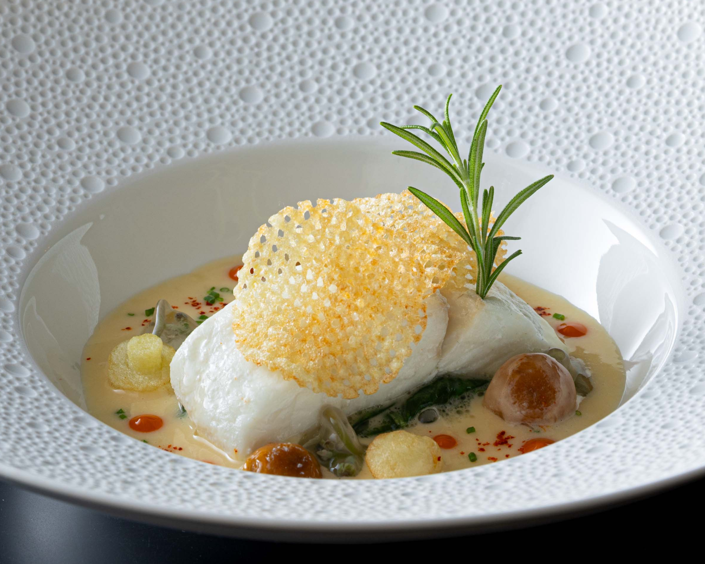 バターが香る酸味の効いたソースに、木滑なめこのフリカッセを添え、奥行きのある味わいに仕上げました。