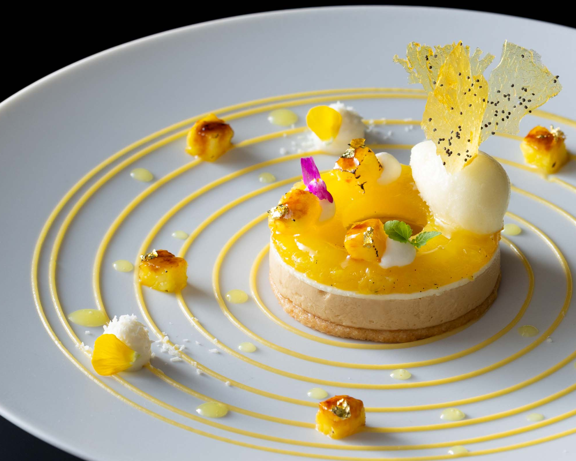 コースの締めくくりには、軽やかな黒糖キャラメルムースに、スパイスを効かせたパイナップルのコンポートやムースを重ねた、夏らしいデザートをご用意しました。