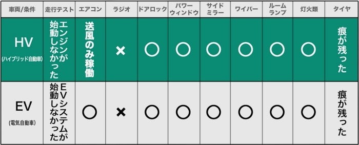 結果:エンジンやEVシステムが始動せず、タイヤも放電痕が残りました。