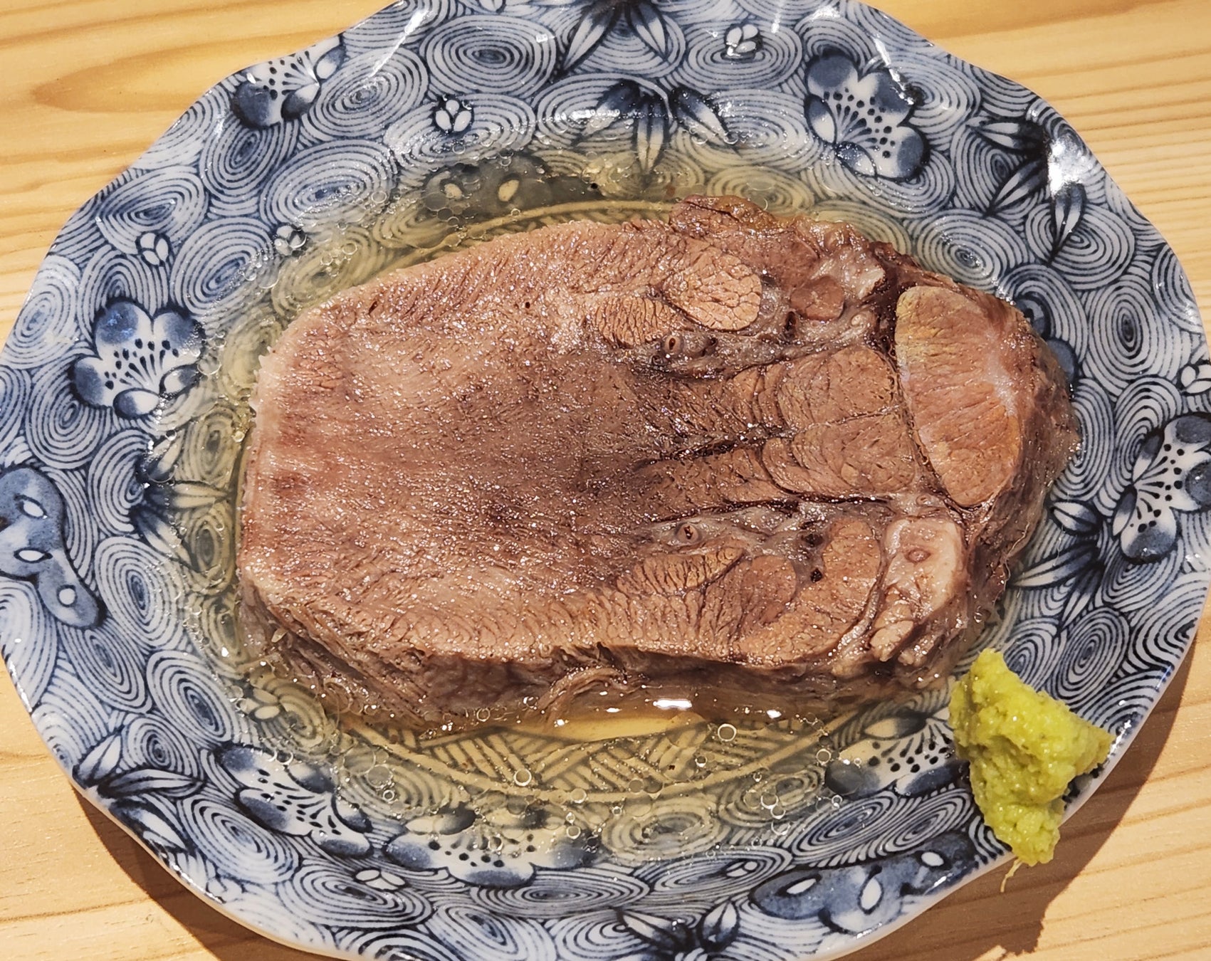 4~5時間ほど時間をかけてじっくり煮込んだ「茹でタン」は、お箸で切れる柔らかさ。わさびをお好みで付けると、牛テールスープの濃厚なコクが引き立ちます。