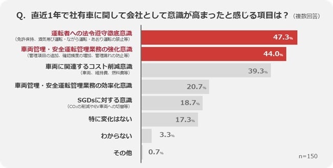 「運転者への法令遵守徹底意識」が47.3%と最多。次いで「車両管理・安全運転管理業務の強化意識」が44.0%と、企業として車両管理業務の徹底・見直し意識が高まっている様子が伺えます。