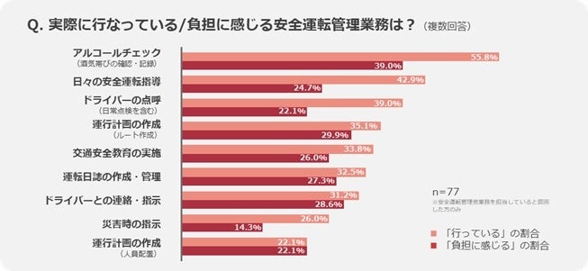 実際に行っている安全運転管理業務について質問すると、2022年4月に施行された道路交通法の改正に伴い、「アルコールチェック」の実施率が最も高かったものの、55.8%と全体の約半数に留まっていることがわかりました。さらに、実際に行っている業務と負担に感じる業務についての回答を比べると、「運行計画の作成(ルート作成・人員配置)」や「ドライバーとの連絡・指示」といった自動化しづらい業務が負担となりやすいことがわかりました。