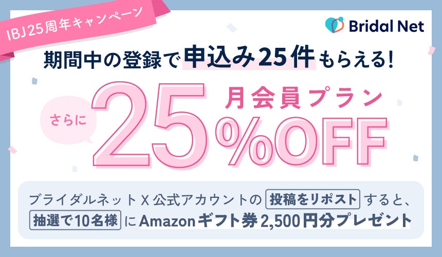 ブライダルネットでは、IBJ25周年を記念し、「25」にちなんだ特別キャンペーンを開催。入会特典や月会費プランの割引に加え、SNSでのプレゼントキャンペーンを実施します。