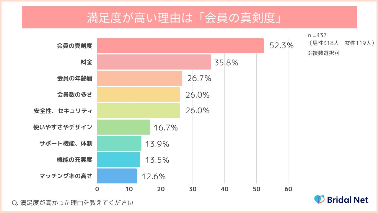 アプリの利用者満足度が高かった理由として、最も多かった回答が「会員の真剣度(52.3%)」という結果に。また、「料金(35.8%)」の項目が次点となりました。無料のマッチングアプリが多い中で、ブライダルネットでは男女ともに同額の月額料金を設定することで、結婚に真剣な方が集まりやすい環境を提供しています。結婚に真剣な方同士で出会えることと、費用に対する納得感を持ちながら婚活を続けられることが、利用者にとって重要な魅力になっているといえそうです。
