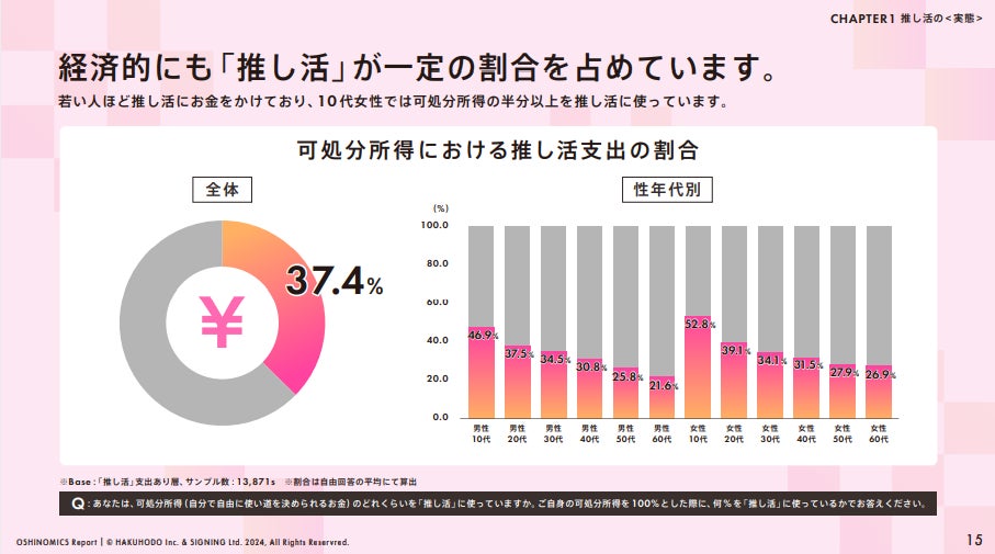 可処分時間のうち平均38.8%と、自由に使える時間のうち4割近くが「推し活」に費やされています。経済的にも同様に、可処分所得のうち平均37.4%を「推し活」に費やしており、「推し活」は、もはや生活の一部を占めるものになっています。