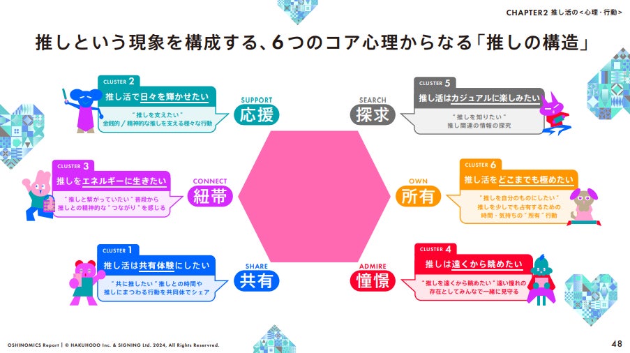 本レポートでは「推し活」をする人びとを6つのクラスターに分類し、推し活に関する価値観や行動を分析しています。
