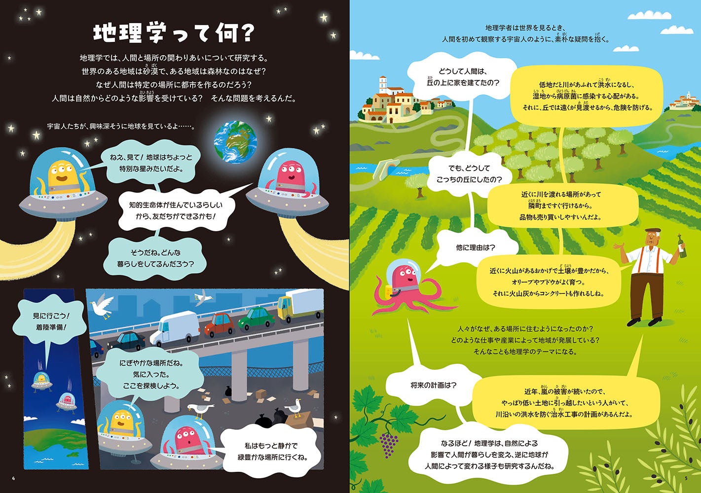 本書『はじめての地理学』は、誰もが一度は不思議に思う、地球に関する素朴な問いを、地球にやってきた宇宙人たちと旅しながら解き明かしていきます。