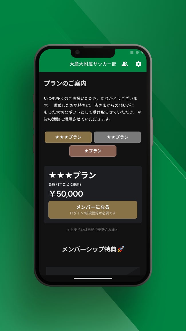 大阪産業大学附属高校サッカー部はSNSを今まで一切やってこなかったチームではありますが、情報発信の起点として公式アプリを活用し、保護者・OBの方々に加え、アプリを通じてチームを知っていただいた方々とチームが繋がる場にしていきたいと思います。また、応援プランに加入して頂いた方には、限定グッズをお届けします。繋がりを通じて、より多くの人々に応援してもらえるチームを目指します。