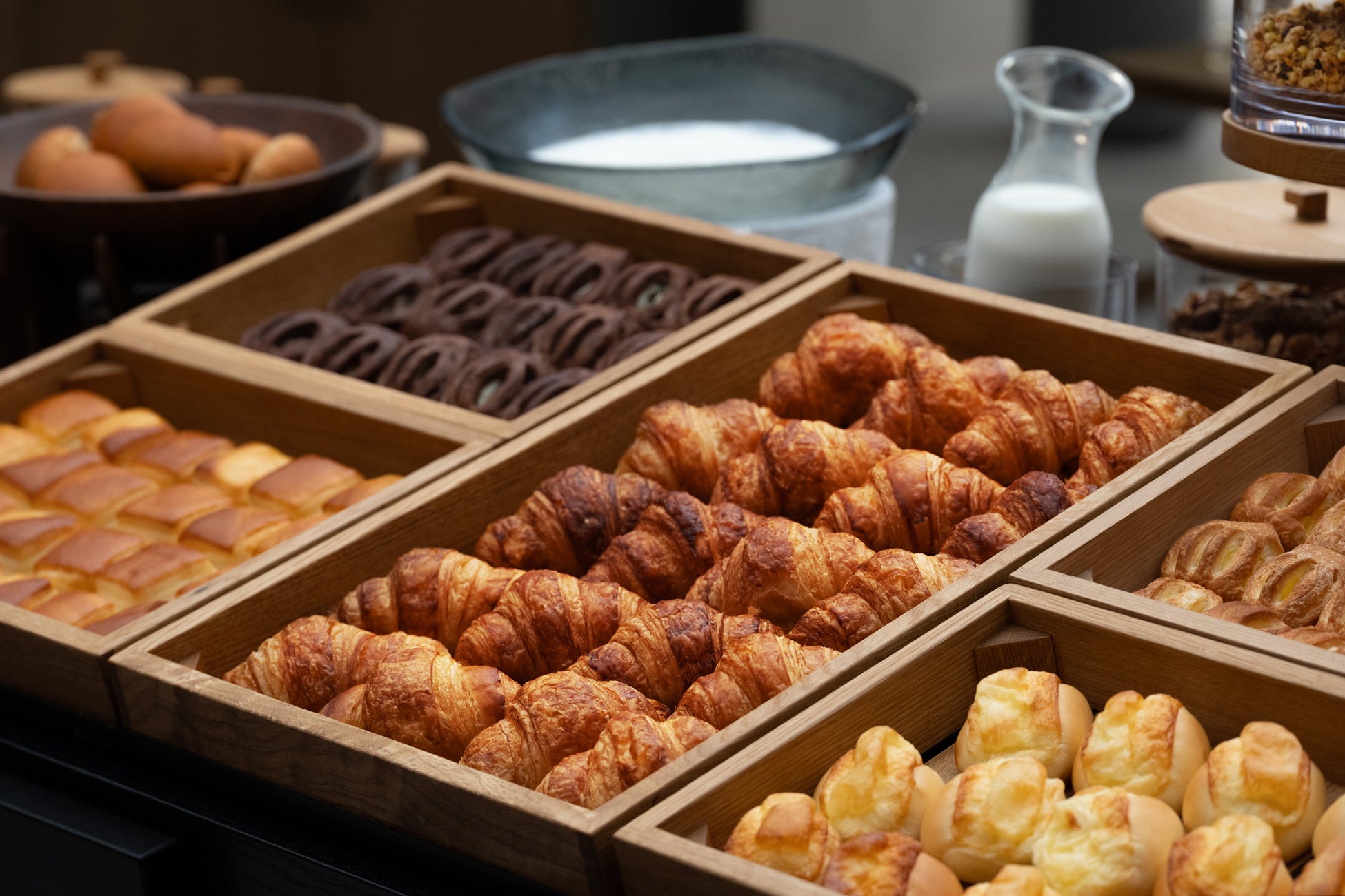 毎朝「EZARO」からは、焼き立ての香ばしいパンとバターの香り、そして淹れたてのコーヒーの香りが漂います。店内のベーカリー工房で焼き上げる「発酵バターのクロワッサン」を始めとする焼き立てパンと、日替わりで提供される「20品目以上の野菜」がカスタムできるパワーサラダが楽しめます。全40種以上のビュッフェメニューは毎日の朝を更に特別な物にしてくれます。