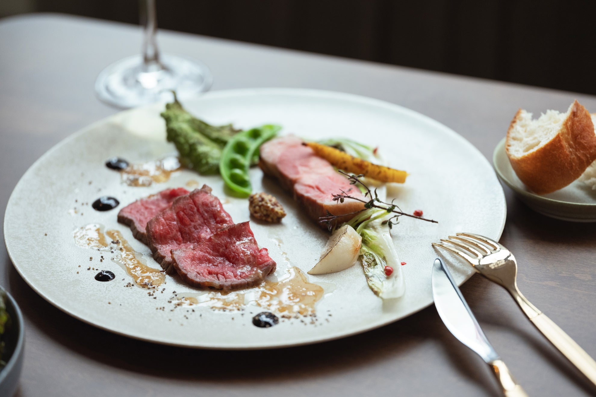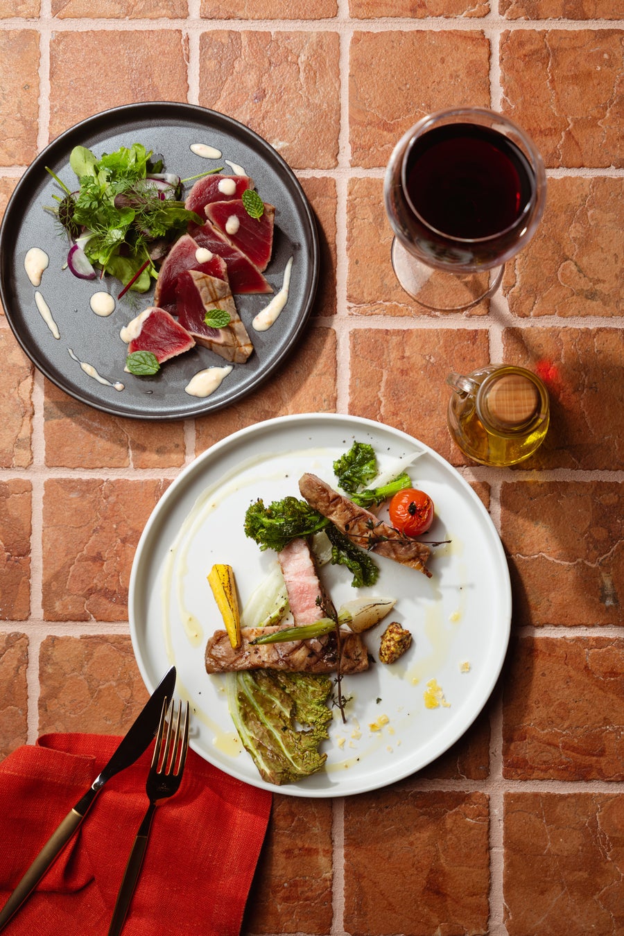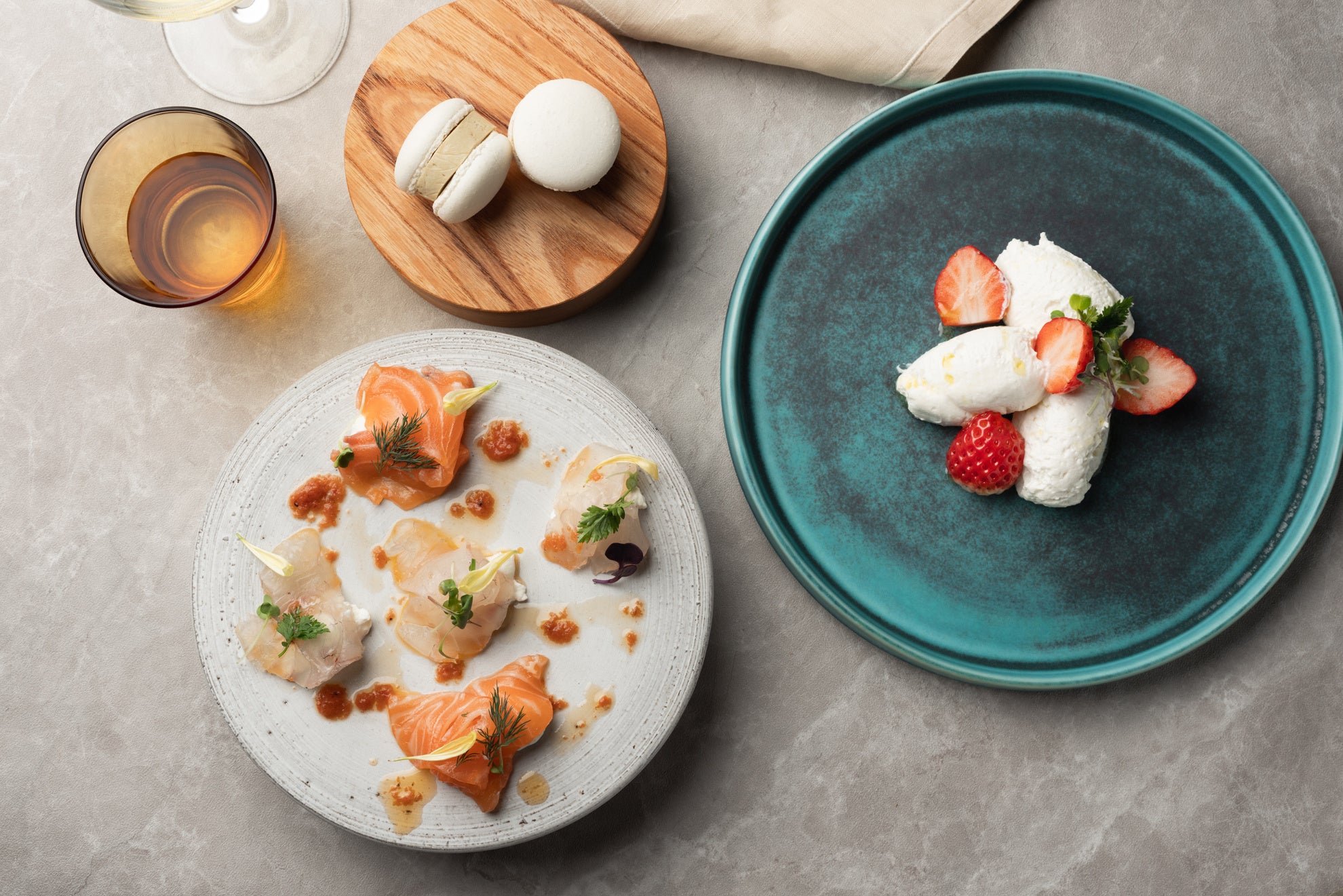 福岡県産黒毛和牛の燻製イチボとマグロレアグリルのWメインコース お一人様8,200円(税込) フリーフロー付き