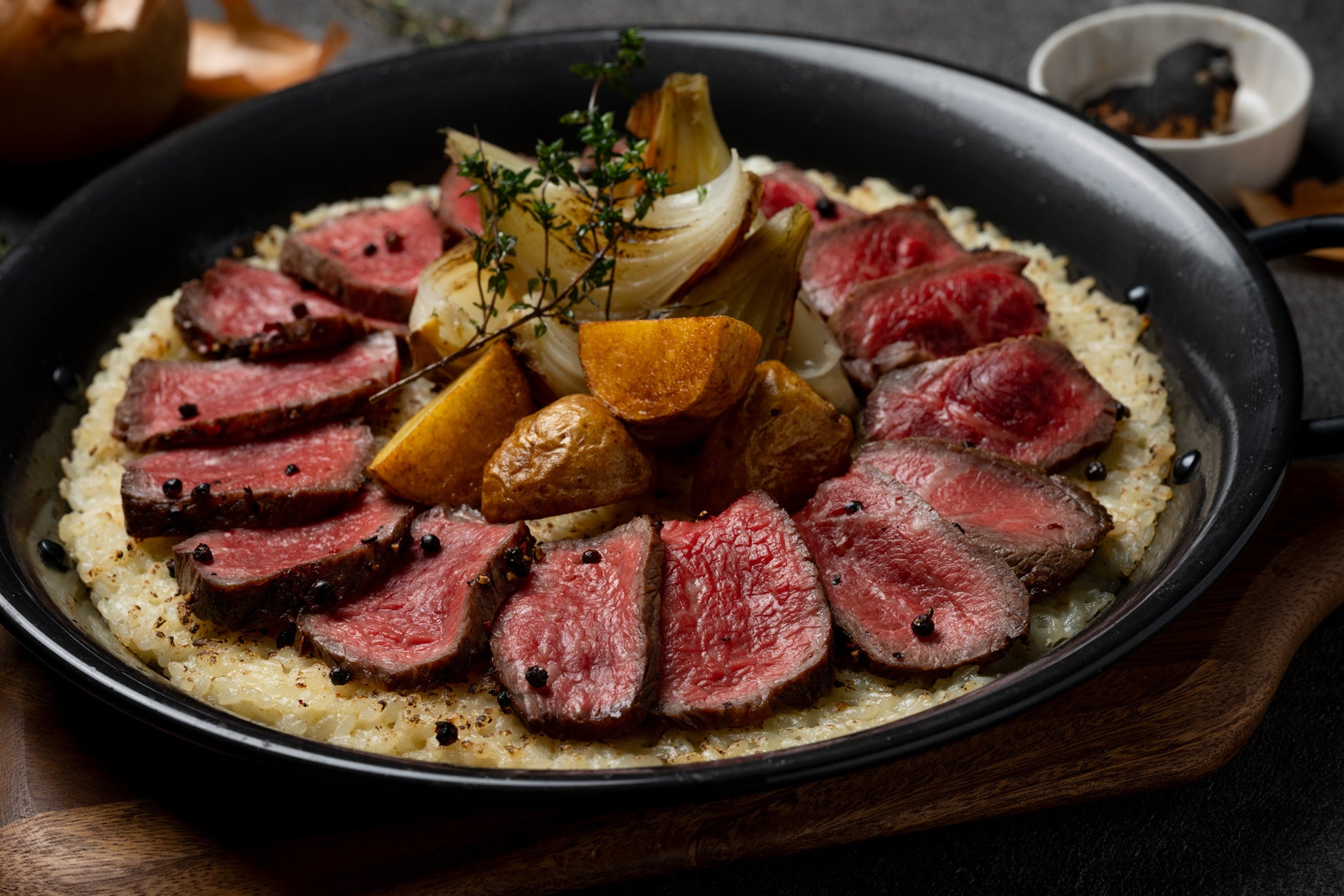 メイン② ・黒毛和牛ステーキとチーズ焼きリゾット 燻製の香りを添えて