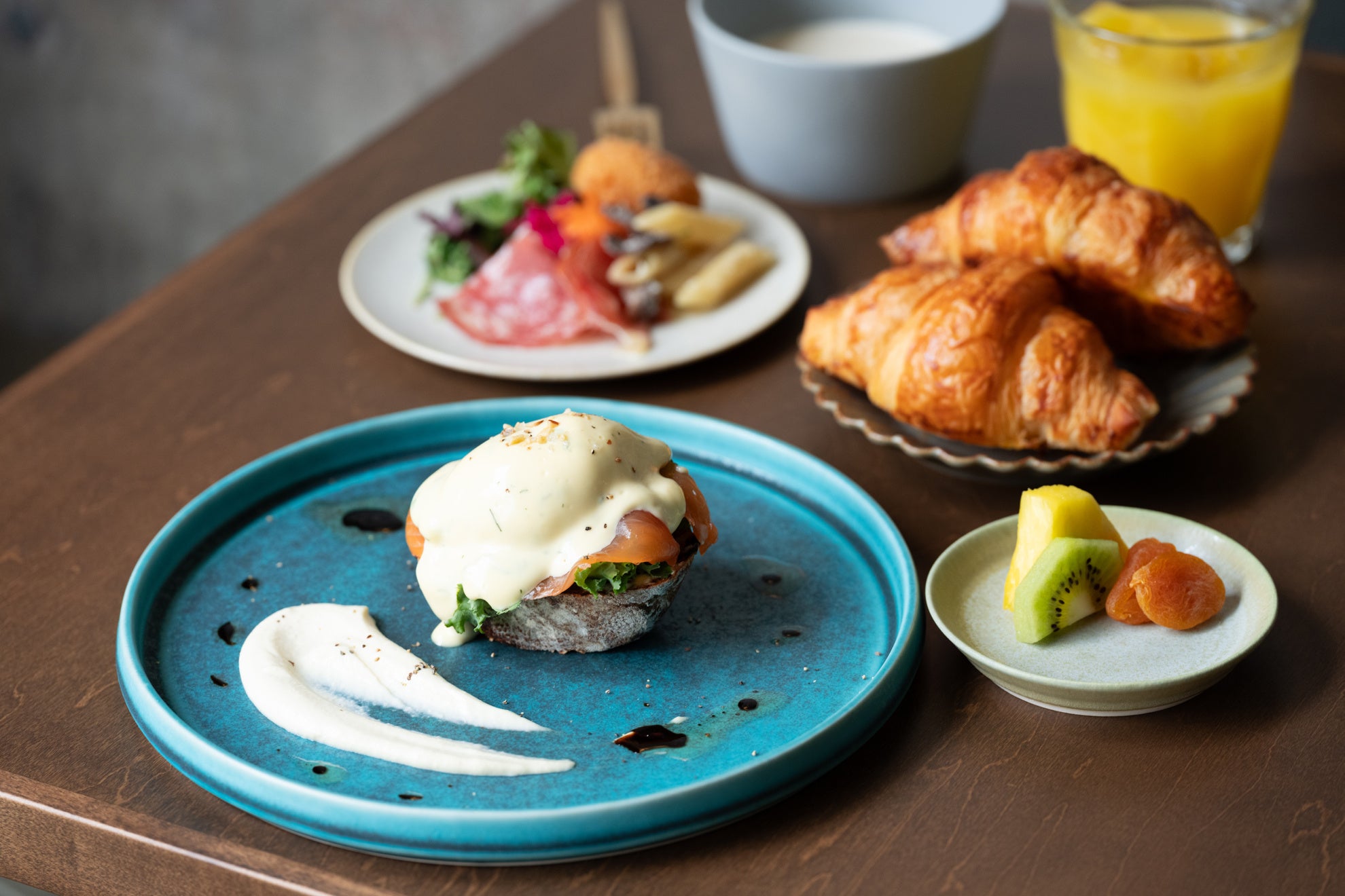 自家製サーモンの旨味をソースと卵で包み込みました。千葉県で大切に育てたイタリア小麦を使用した旨味の強い食事パンと軽やかに楽しむオリジナルエッグベネディクトです。