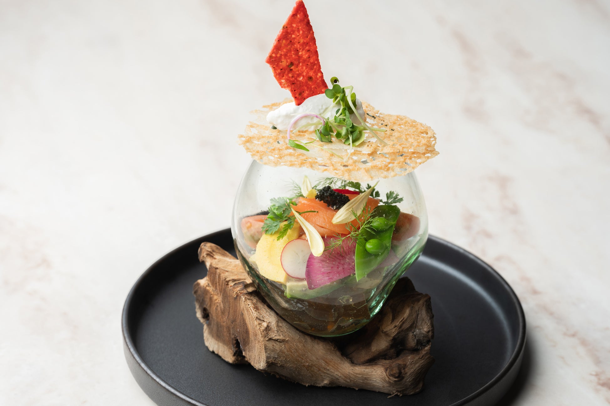 ①農園野菜とサーモンのパフェ仕立て オマールビスクのジュレを添えて 900(990)