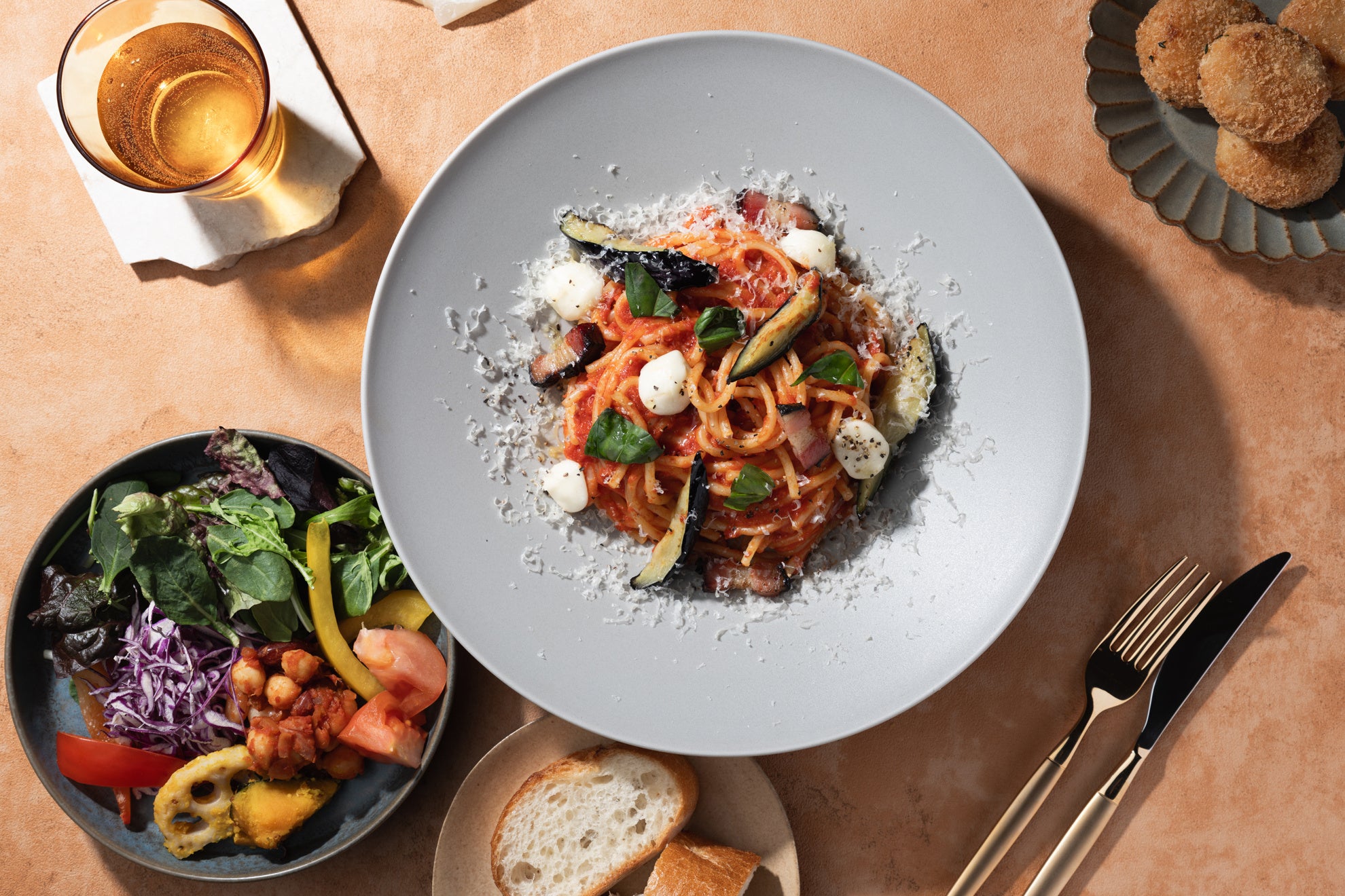 メインは、毎朝淡路島から直送される生麺を使った「全25種から選べる生パスタランチ」をお楽しみください。”トマト系“ ”オイル系“ ”2種のクリーム系“ ”ミート系“からなる5種類のソースと選び抜かれた5種の生麺の組合せ(5×5=25種)から生パスタを味わえるLUNCHメニューです。