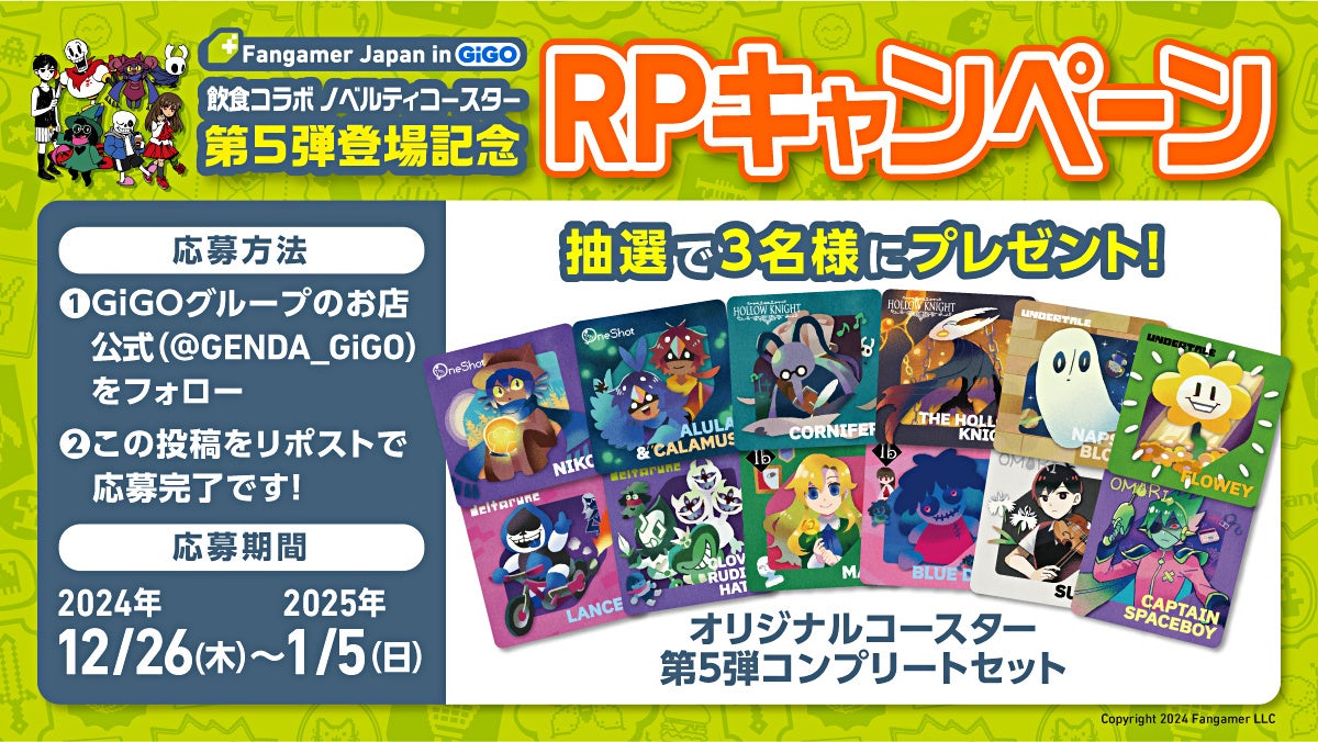 Xアカウント( https://x.com/GENDA_GiGO )をフォローの上で、該当の投稿をリポストされたお客さまの中から抽選で3名さまに「オリジナルコースター第5弾コンプリートセット(全12種)」をプレゼントいたします。