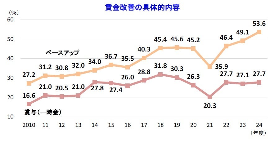 賃金改善の具体的な内容をみると、「ベースアップ」が53.6%(前年比4.5ポイント増)、「賞与(一時金)」が27.7%(同0.6ポイント増)となった。「ベースアップ」は過去最高となった前年の49.1%を上回り、3年連続で調査開始以降の最高を更新するなど、初めて半数を上回った。