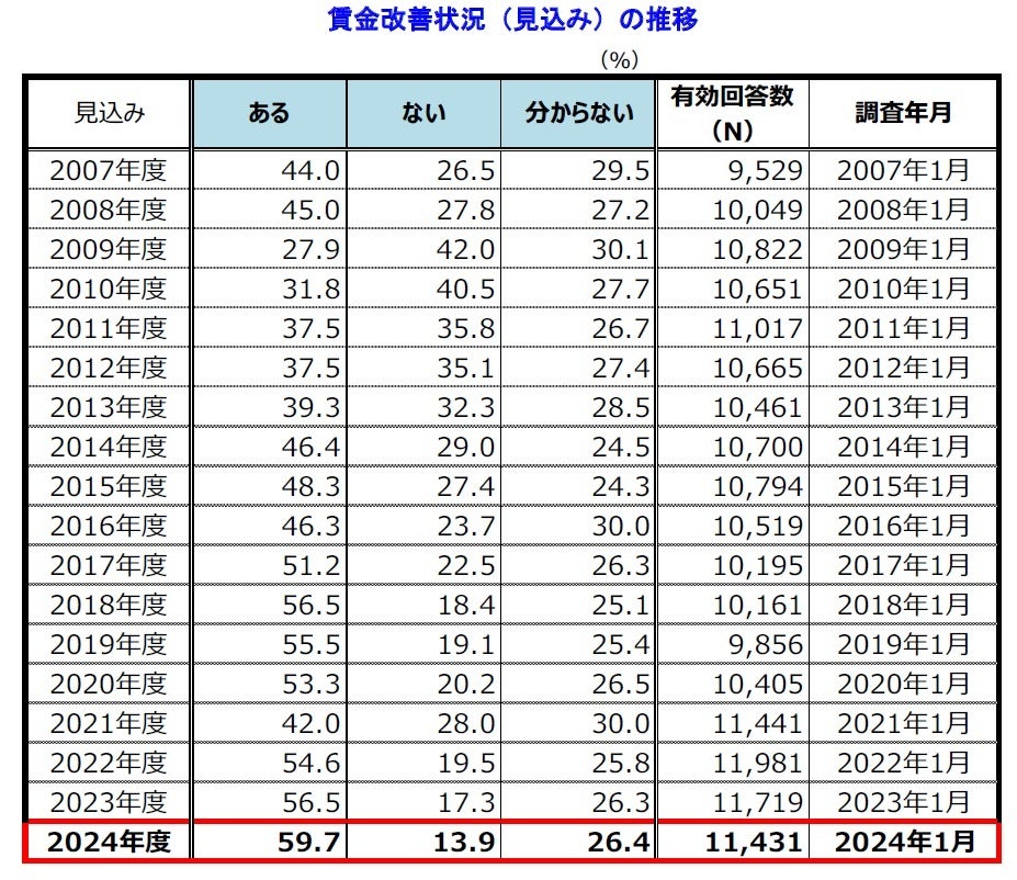 ※ 調査期間は2024年1月18日~1月31日、調査対象は全国2万7,308社で、有効回答企業数は1万1,431社(回答率41.9%)。なお、賃金に関する調査は2006年1月以降、毎年1月に実施し、今回で19回目