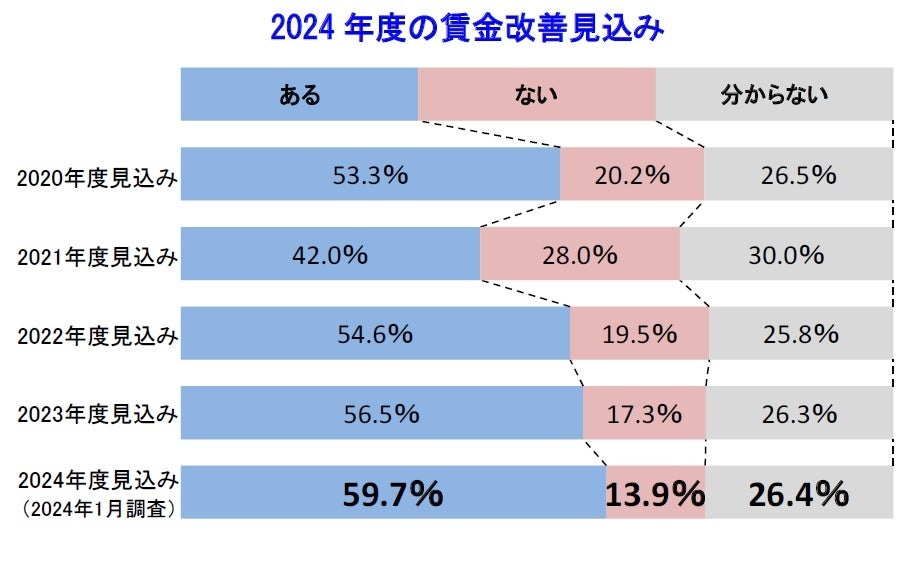 2024年度、過去最高となる59.7%の企業で賃金改善を見込む。ベースアップは過去最高を記録