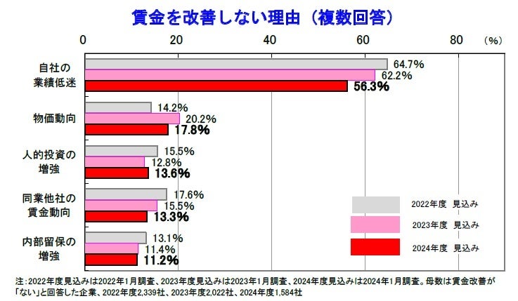 賃金を改善しない理由、「自社の業績低迷」が56.3%でトップ