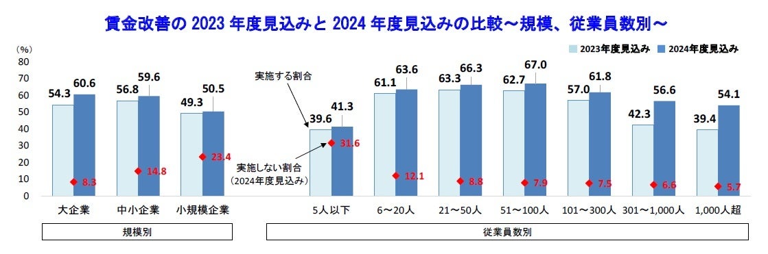 賃金改善の状況について企業規模別にみると、「大企業」「中小企業」「小規模企業」の3規模すべてで、前回調査の2023年度見込みから賃金改善見込みの割合が上昇した。また、従業員数別では、「6~20人」「21~50人」「51~100人」「101~300人」で6割を超えている。「5人以下」(41.3%)では賃金改善を行う割合が低くなっているが、初めて4割台に達した。