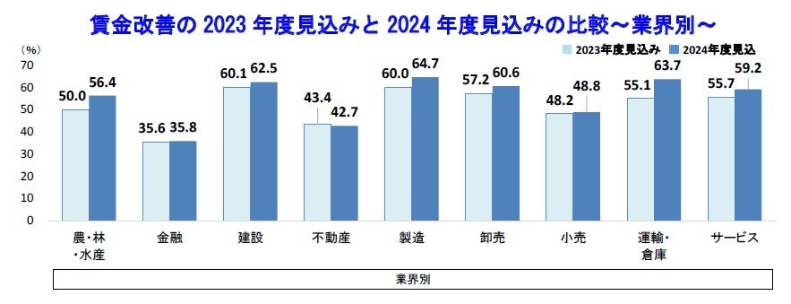 業界別では『製造』(64.7%)が最も高く、『運輸・倉庫』(63.7%)や『建設』(62.5%)が続いている。2024年4月から時間外労働の上限規制が始まるトラックドライバーや建設業界などで、賃金改善を実施する企業の割合が昨年より高まっていた。