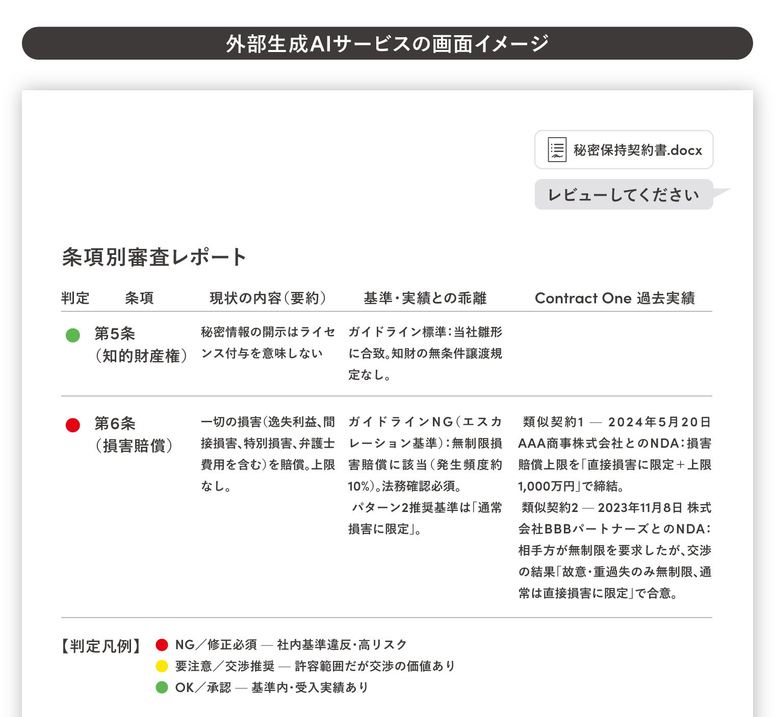 例えば、生成AIに簡単な指示を入力するだけで、暗黙知になりがちな「どの条件なら許容できるか」という判断基準をまとめた「自社基準」を作成することが可能です。さらに契約書のドラフトを入力すると、自社基準を参照しながら、注意すべき点を出力し、レビューを支援します。