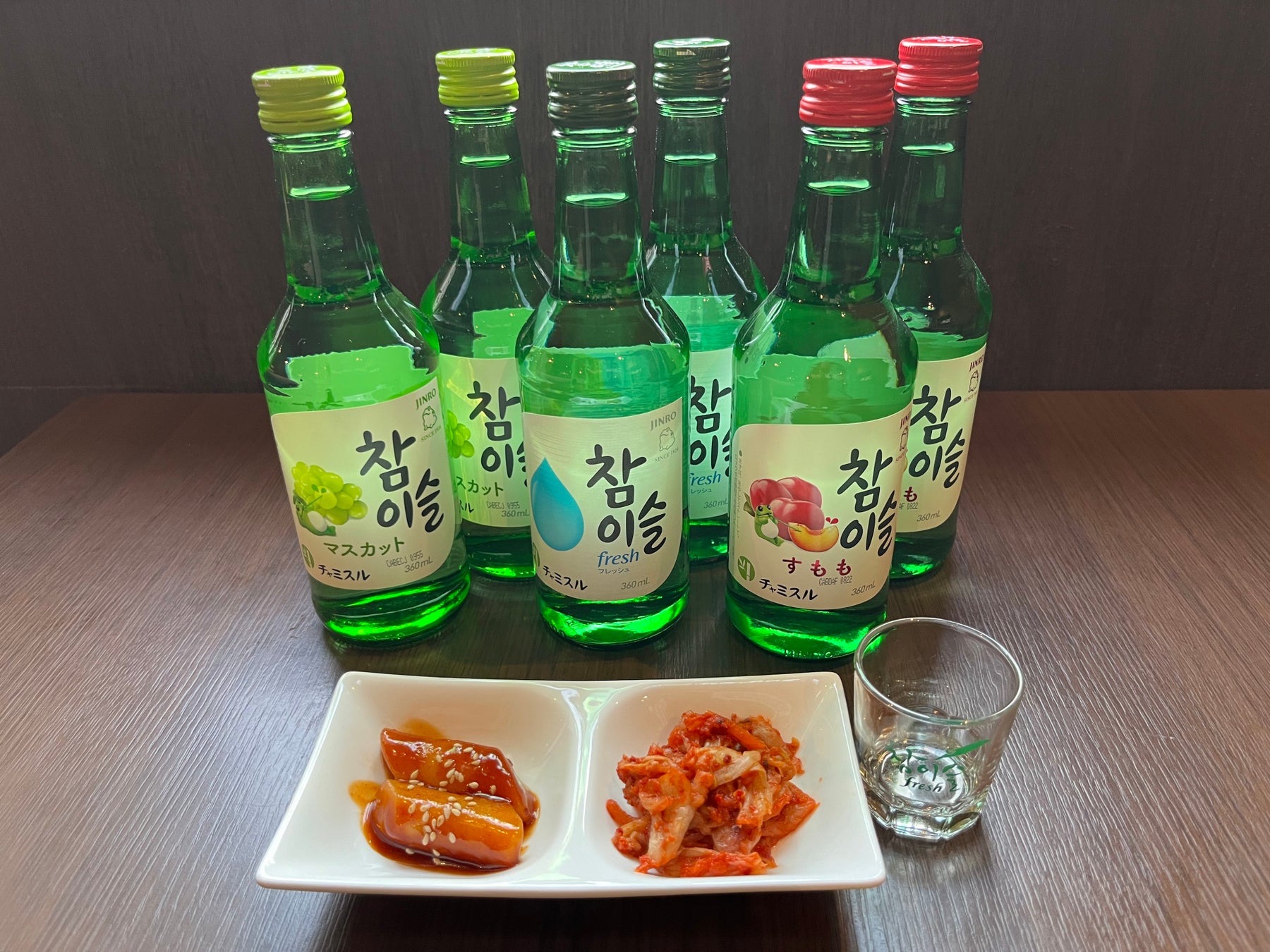 ●チャミスルセット・・・人気の韓国焼酎「チャミスル(360ml)」とおつまみ2品セット 650円(税込)。「チャミスル」は、マスカット、フレッシュ、すももの3種類からお選びください。