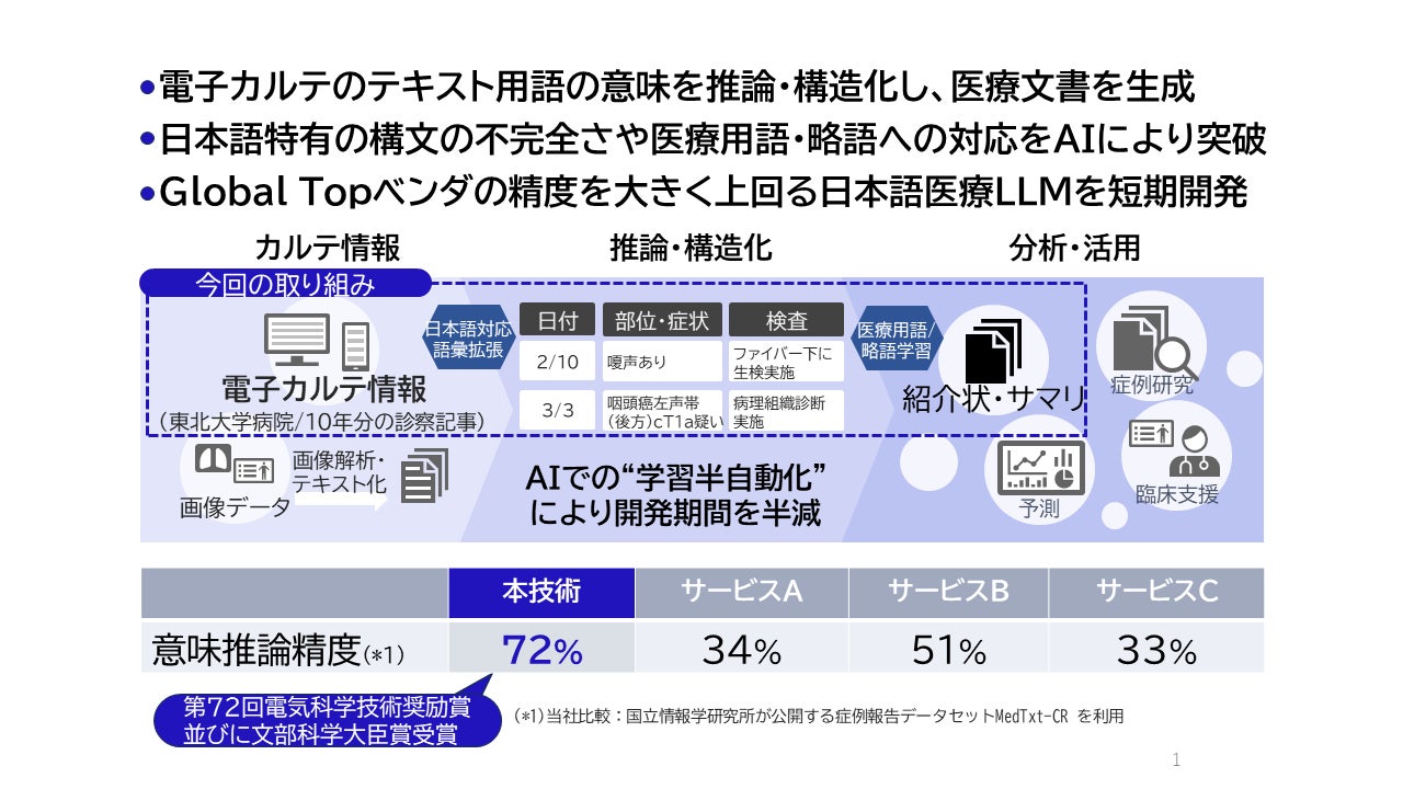 このような課題に対応すべく、NECと東北大学病院は、日本語の医療分野で実用可能な大規模言語モデル(LLM)を研究・開発しました。このモデルは、電子カルテのテキスト用語を推論・構造化し、紹介状や退院サマリなどの医療文書を自動生成するものです。この技術を活用することにより、医師の医療文書作成時間が平均47%削減されることが確認されています。