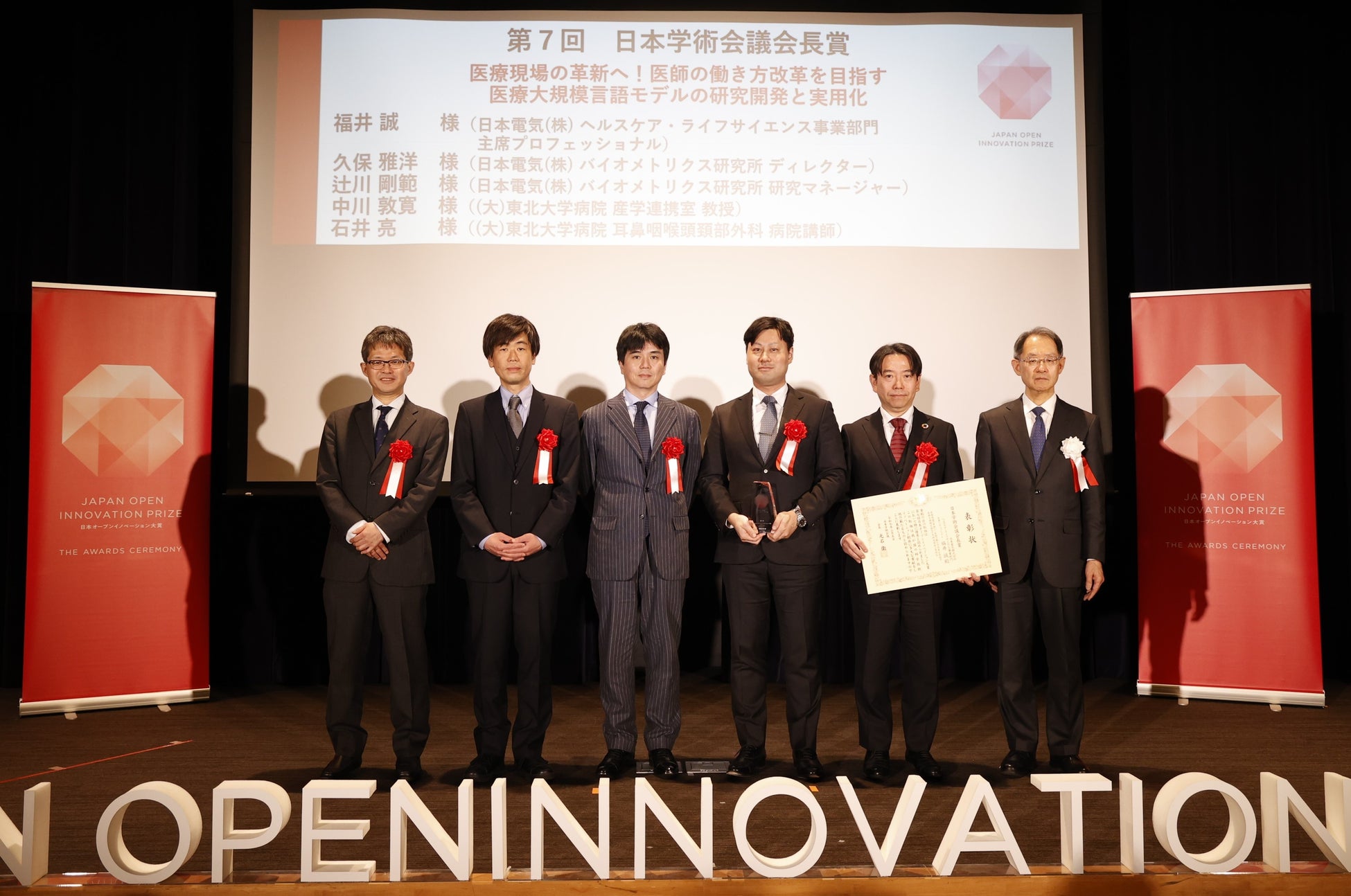 日本電気株式会社(以下NEC)と東北大学病院が共同で取り組んだ「医療現場の革新へ!医師の働き方改革を目指す医療大規模言語モデルの研究開発と実用化」が、内閣府主催の「第7回日本オープンイノベーション大賞(注1)」にて日本学術会議会長賞を受賞しました。