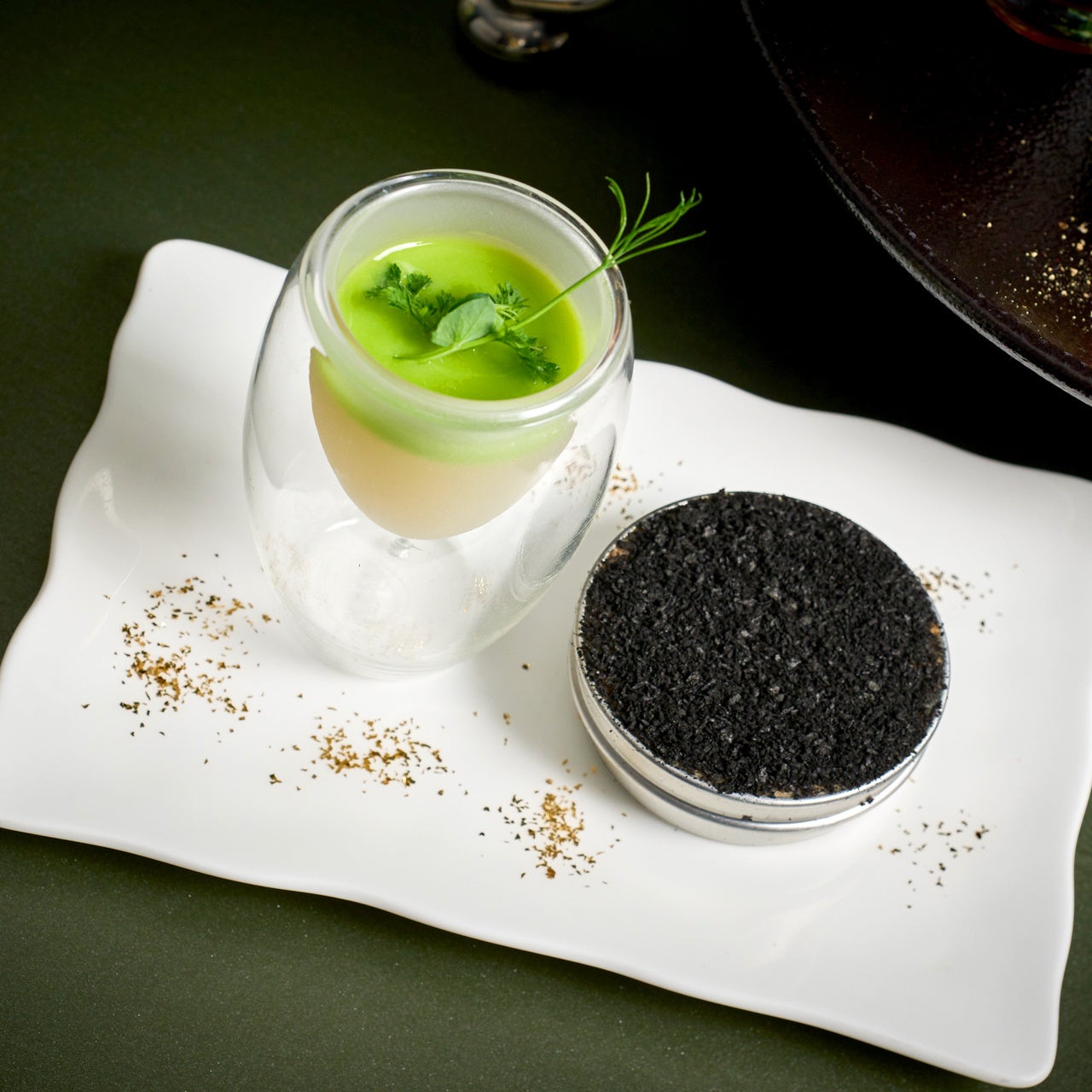 ベルガモットのチョコレートに帽子を被せ、ミルクアイスを添えてウィキッドカラーに仕上げたミニパフェ。チョコレートクリームの中には赤いベリーのソースを忍ばせ、様々な食感と味わいが調和した1品に仕上げます。