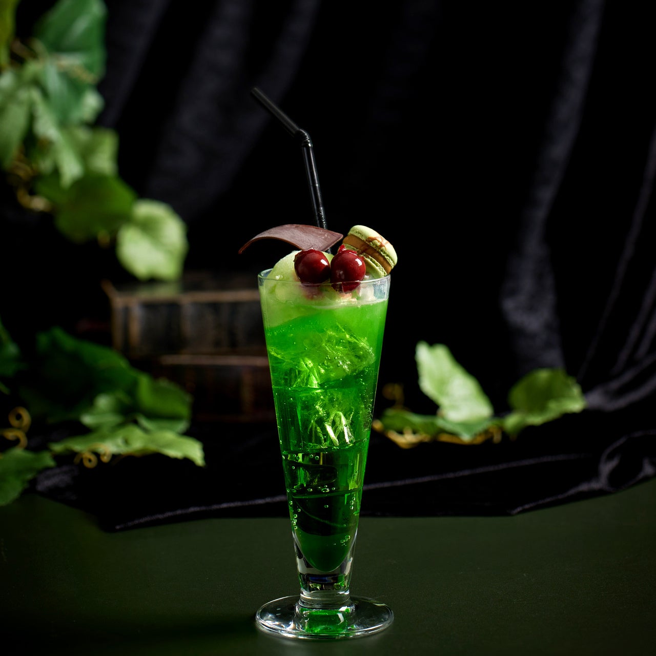 メロンシャーベットとマカロンを添えて、『ウィキッド』カラーをイメージしたエメラルドグリーンのクリームソーダ。ブラックチェリーをアクセントに、爽やかな味わいをお楽しみいただけます。