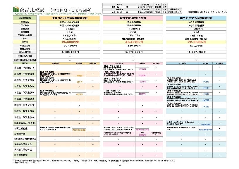 お客様のご希望をもとに保険商品を検索し、その中からさらにお客様のご希望に沿った複数の保険商品を同じフォーマットで並べた比較表をお出しします。別々の保険会社・保険商品で並べたり、同じ保険商品の中でも保障額や特約を変更して並べることもできます。ご希望に沿わない場合は条件を変更して何度でもお出しいたしますので、ご納得できるまで比較頂けます。