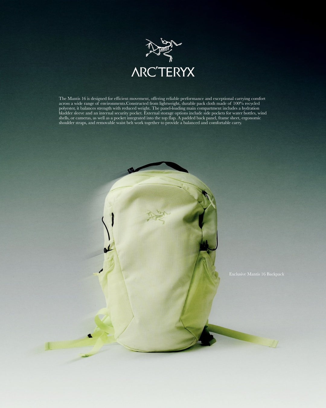 スピーディに移動するときに頼りになるマンティス 16。効率よく整理して収納でき、どんな環境でも快適な背負い心地です。100%リサイクルポリエステルを使用した、軽量で強度に優れたパッククロスを採用。パネルロードのメインコンパートメントはハイドレーションブラッダー用のスリーブと内部セキュリティポケットがあります。水筒やウィンドシェル、カメラの収納に最適なサイドポケットや、フラップ部のポケットなど、外側のストレージも充実しています。