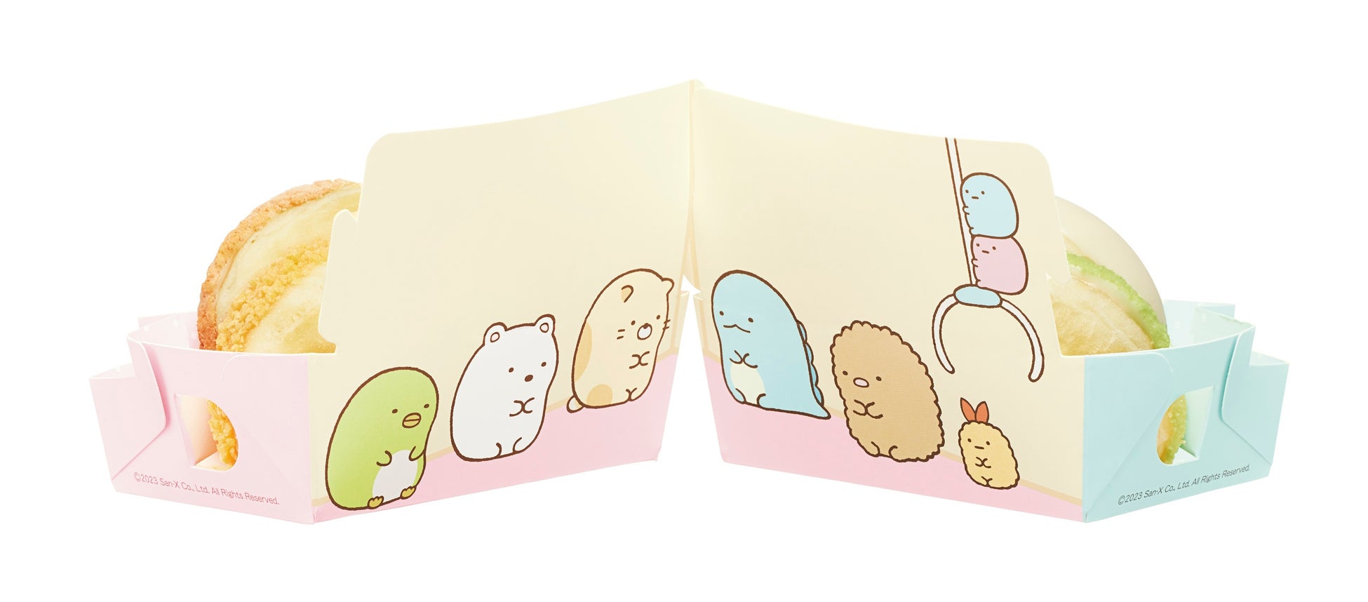 「そらいろ」「ももいろ」のトレイの角をつなげると、‟すみっこ“ができ、すみっコぐらしのキャラクターたちがすみっこにあつまる様子ができあがります。ドーナツのみならず、トレイのイラストでもミスタードーナツとすみっコぐらしの世界をお楽しみいただけます。