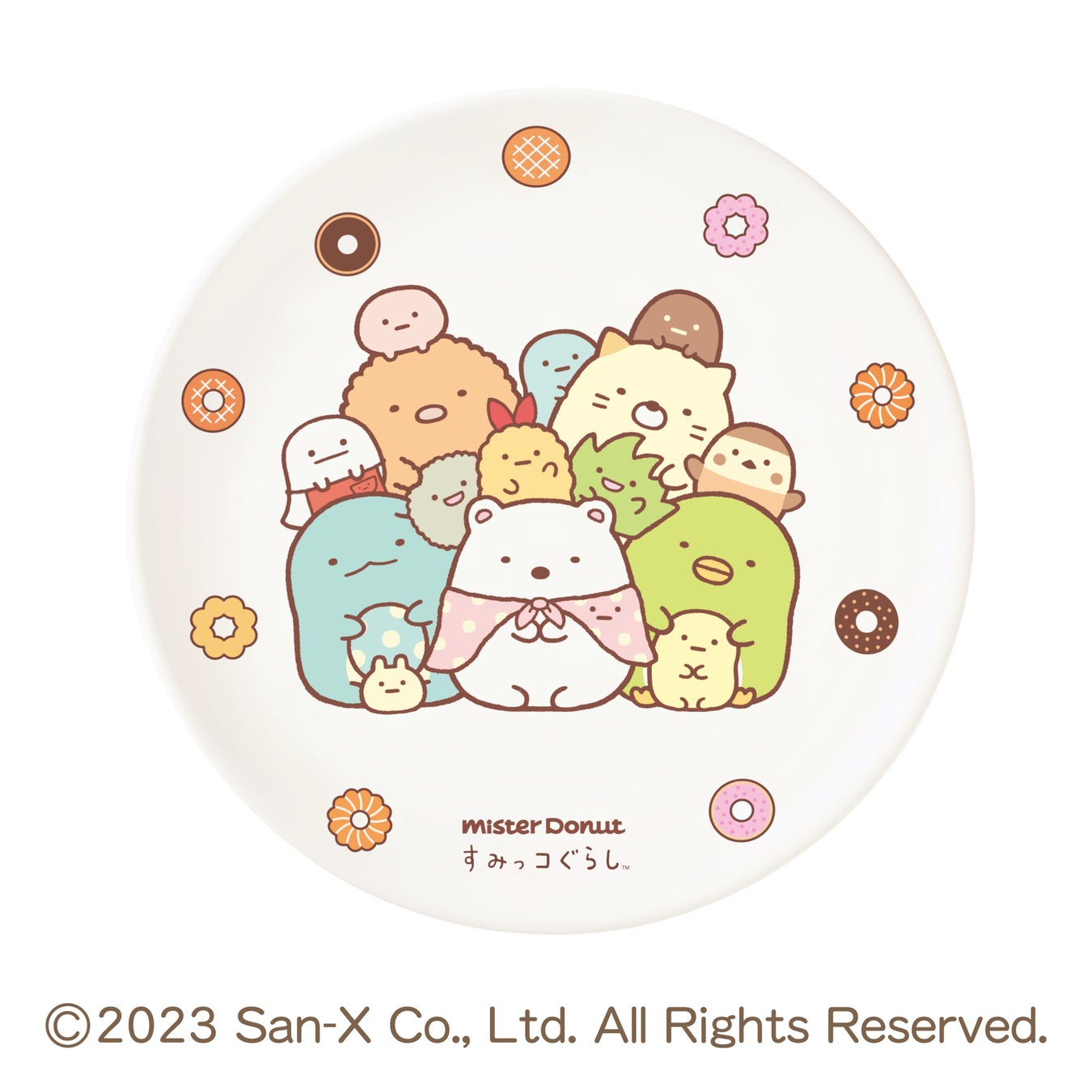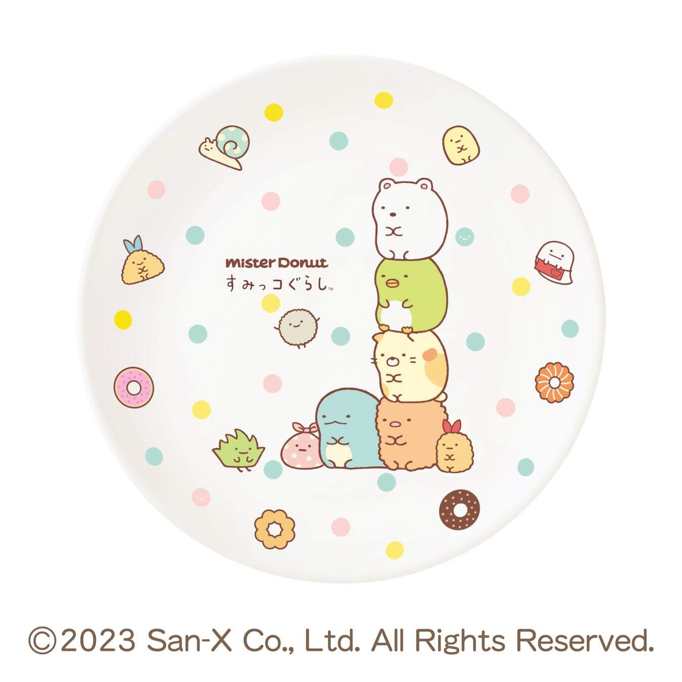 軽くて使いやすいメラミンプレートに、すみっコぐらしの特長であるキャラクター達がぎゅっと集まった様子を表現した「ぎゅっと」や、キャラクターがたてづみとなっている様子を表現した「たてづみ」のデザインに、ミスタードーナツのドーナツデザインを施し、今回のコラボレーションならではのデザインが完成しました。