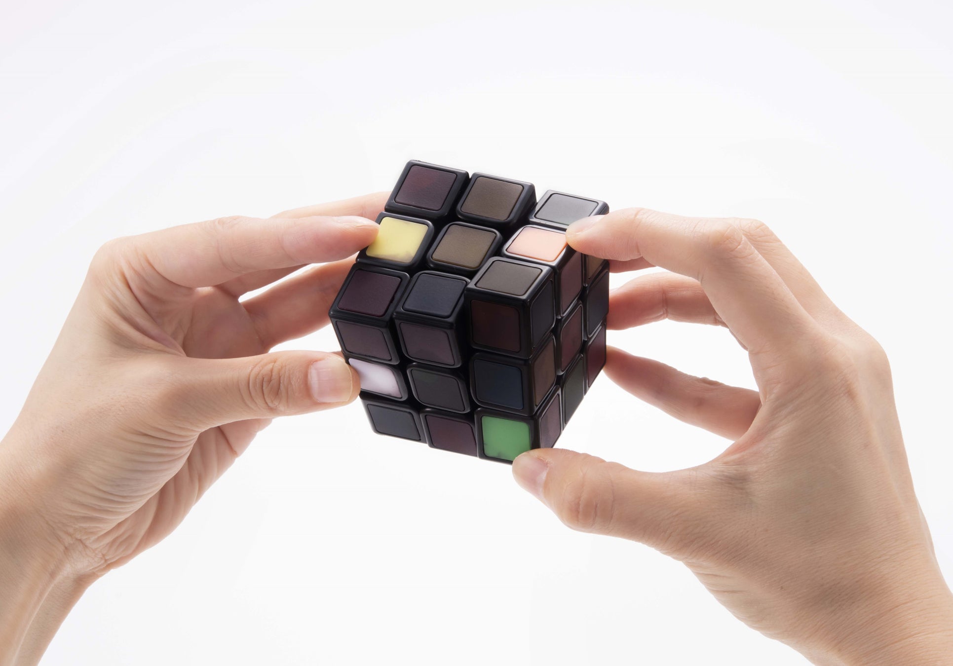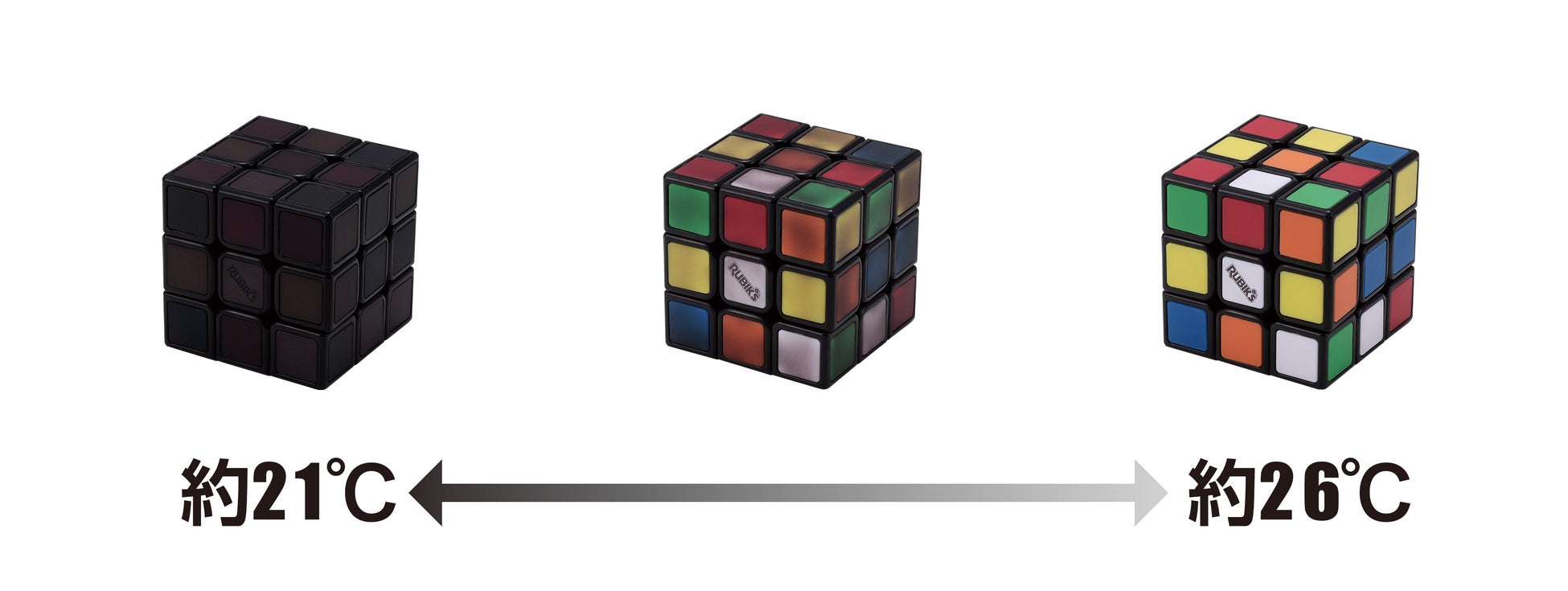 本商品は、温度変化に応じてルービックキューブの表面の色が変化する新感覚のルービックキューブです。表面のパネルは、気温やルービックキューブ表面に接触した時の温度が、約21度以下の時は真っ黒な状態ですが、約26度以上になると通常のルービックキューブ同様に6色カラーがはっきりと出現してきます。全面真っ黒の状態からルービックキューブを揃えていくと、触れた所だけ体温の温かさで色が現れてきます。一か所に長く触れずに素早く回転させていくと、各色が現れづらく視覚が惑わされて難易度があがります。また、色が変わる途中に現れる独特のグラデーションも趣きがあり、これまでにない不思議なルービックキューブです。
