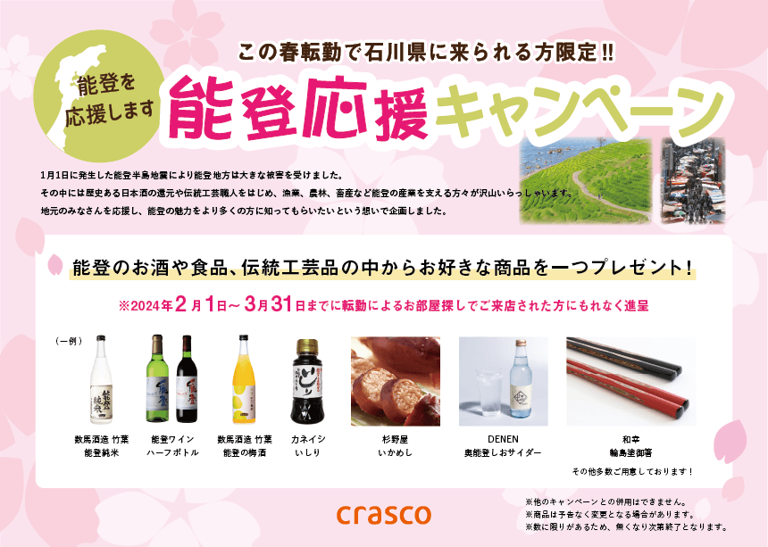 内容 : クラスコご来店で、能登のお酒や食品、伝統工芸品などの名産品の中からお好きな商品をプレゼント