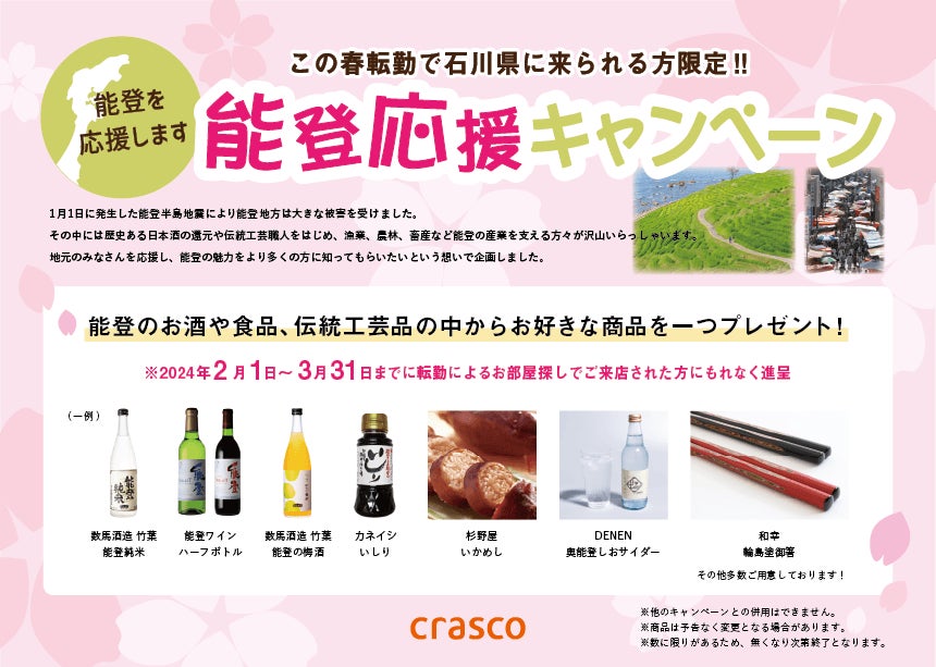 震災発生以降、クラスコでは被災された方々の住居確保を支援するため、仲介手数料の免除(※一部条件あり)や、最大6ヶ月分の家賃負担(※対象物件に限り)といった具体的な施策を実施しております。2024年1月28日現在、住居相談は1,500件を超えており、地震の被害の深刻さを痛感しております。私たちは、転勤で新たに石川県に足を踏み入れる皆様に、能登の伝統と文化、そして豊かな自然が生み出すお酒や食材の魅力を体験していただくため、厳選した地元特産品をご用意しました。これらの贈り物を通じ、被災前の能登地区が持つ自然の豊かさや伝統文化を伝え、新住民の皆様と地域社会との絆を深める機会にしたいと考えています。震災からの復興は、まだ始まったばかりです。多くの課題が残る中、私たちは一人でも多くの方々に能登の魅力を知っていただき、一歩ずつ前進していきたいと考えています。転勤で石川県にお越しの皆様、この機会に能登の特産品をぜひお楽しみください。