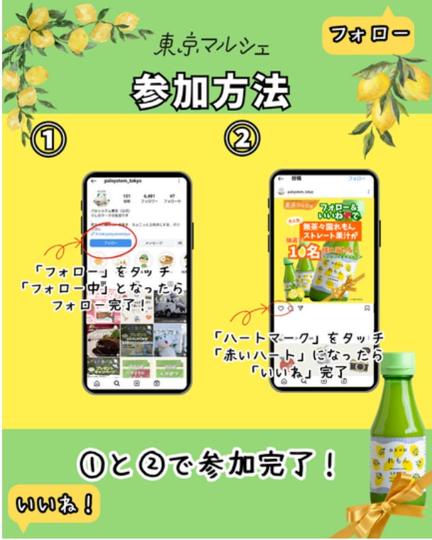 生活協同組合パルシステム東京(本部:東京都新宿区大久保、理事長:西村陽子)は7月6日(日)まで、公式SNSで「東京マルシェ」商品プレゼントキャンペーンを実施します。公式SNSフォローと対象投稿へのリポスト・いいねで、「無茶々園れもんストレート果汁150ml」を抽選でプレゼントします。