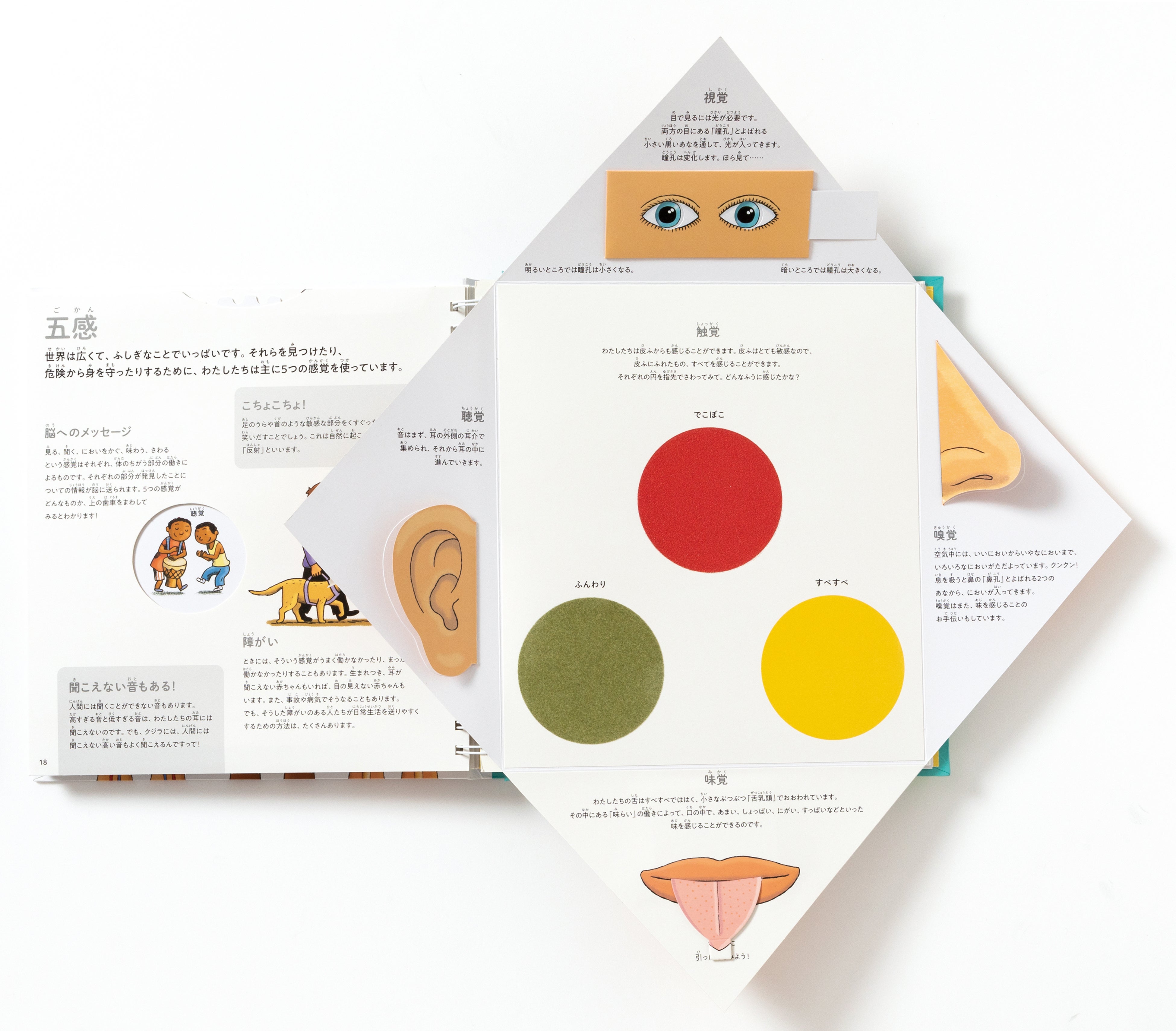 コンテンツ:生まれる前・誕生・成長・骨・心臓と血液・呼吸・消化・脳・五感・口と歯・病気・皮ふ