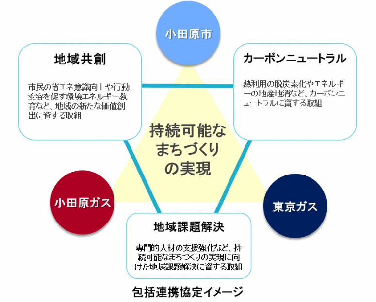 小田原市(市長:守屋 輝彦)、小田原ガス株式会社(社長:原 正樹、以下「小田原ガス」)、東京ガス株式会社(社長:内田 高史、以下「東京ガス」)は、本日、「持続可能なまちづくりの実現に向けた包括連携協定」(以下、「本協定」)を締結しました。