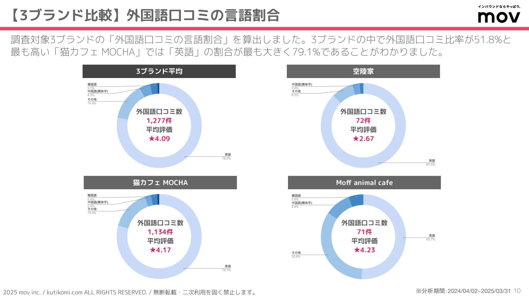 調査対象3ブランドの「外国語口コミの言語割合」を算出しました。
