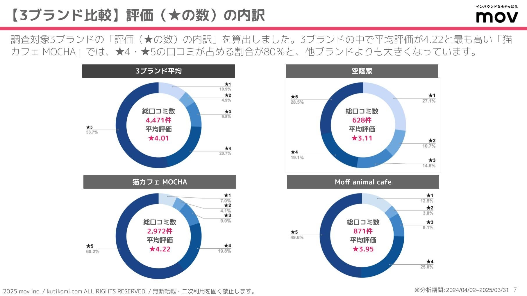 3ブランドの中で平均評価が4.22と最も高い「猫カフェ MOCHA」では、★4・★5の口コミが占める割合が80%と、他ブランドよりも大きくなっています。